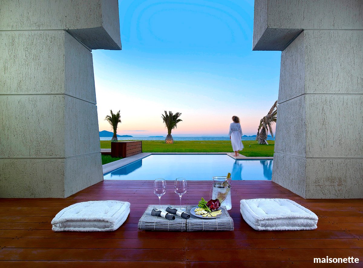 standardowy: 2-os. (możliwość 1 dostawki), ok. 28 m², elegancki i nowoczesny, indywidualnie sterowana klimatyzacja, łazienka (wanna, wc; suszarka), bezpłatne łącze internetowe, telewizja satelitarna, telefon, zestaw do kawy i herbaty, minibar, sejf; bezpłatne łóżeczko dla dziecka do 2 lat na zamówienie przed przyjazdem; balkon lub taras (stolik i krzesełka), widok na ogród lub basen; widok na morze za dopłatą; pokój ze wspólnym basenem: 2-os. (możliwość 1 dostawki), ok. 28 m², elegancki i nowoczesny, wyposażenie jak w pokoju standardowym; wspólny basen dla kilku pokoi; rodzinny: 2-os. (możliwość 1 lub 2 dostawek dla dzieci- sofa), ok. 38 m², pokój dzienny i sypialnia, wyposażenie jak w pokoju standardowym; widok na ogród, pokój rodzinny za dopłatą; maisonette z widokiem na morze i dzielonym basenem: 2-os. (możliwość 1 lub 2 dostawek), ok. 88 m², dwupoziomowy, pokój dzienny na parterze i 2 sypialnie, 2 łazienki, wyposażenie jak w pokoju standardowym; maisonette na zamówienie, za dopłatą.