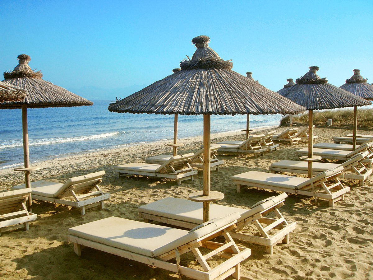 Lambi, hotelowa, piaszczysto-żwirowa, łagodne zejście do morza, przy wejściu kamienie - zalecane obuwie ochronne, wąska, ok. 20 m od hotelu, przejście przez drogę lokalną o małym natężeniu ruchu, bezpłatne parasole, leżaki, materace, ręczniki za kaucją (ok.10 EUR/szt.); na plaży prysznice.