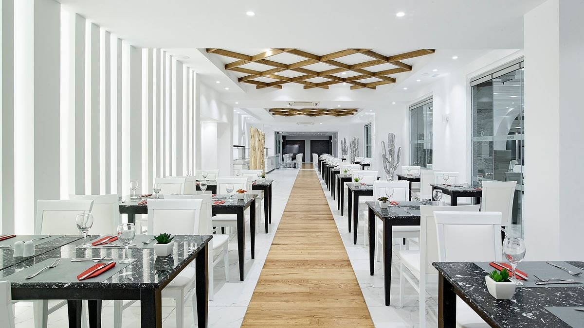 wczesne śniadanie kontynentalne (6.30-7.00), śniadanie (7.00-10.30) w restauracji Flavors, obiad (12.30-14.30) w restauracjach Flavors i Thalasa & Alati, dania w restauracjach w formie bufetu i à la carte, kolacja (18.30-21.30); przekąski, lody, desery (10.30-17.30) w wyznaczonych barach, późne przekąski (23.00-24.00) w restauracji Flavors; napoje bezalkoholowe i lokalne napoje alkoholowe w barach (09.30-01.00); wymagane noszenie opasek all inclusive.