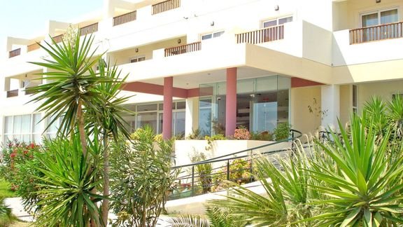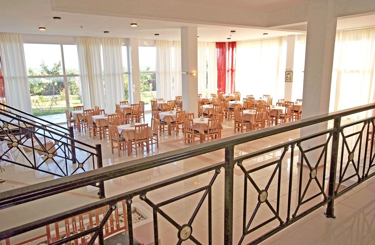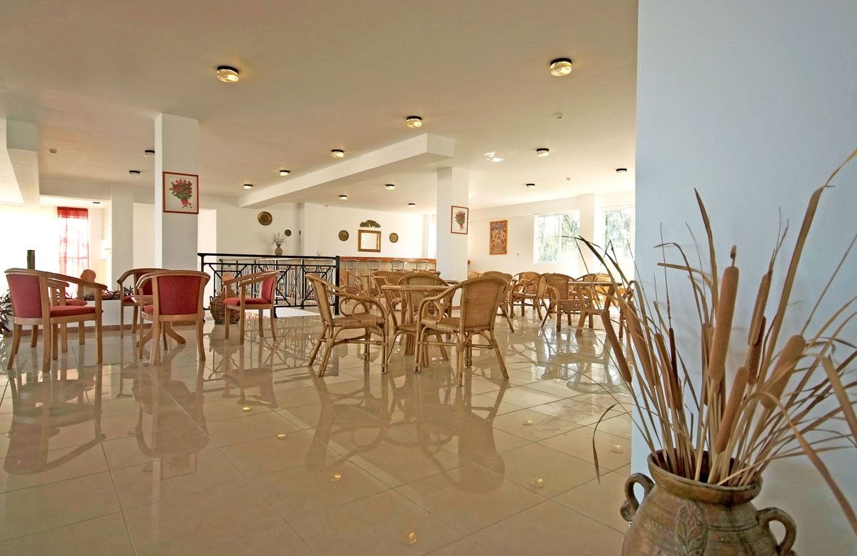 czterogwiazdkowy, skromny i zadbany, zbudowany w 2003 r., 5 budynków, 1 piętro, przestronne lobby, całodobowa recepcja, restauracje: główna – dania w formie bufetu, kuchnia międzynarodowa, przy basenie – obsługa kelnerska, kuchnia grecka, przekąski, w restauracjach dostępne menu i foteliki dla dzieci, dania wegetariańskie, 2 bary: przy recepcji i przy basenie, minimarket; taras z widokiem na basen, ogród; za opłatą: internet bezprzewodowy (ok. 5 EUR/dzień), sejf w recepcji (ok. 12 EUR/tydz.); akceptowane karty kredytowe: Visa, MasterCard.