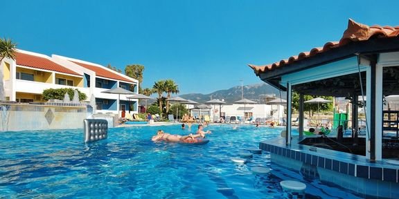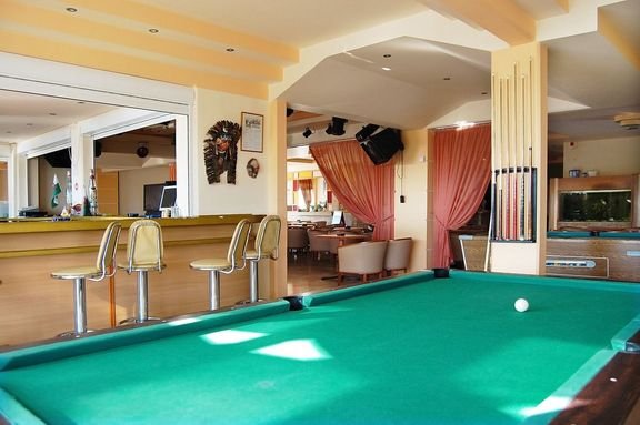 2 baseny, słodka woda, ok. 200 m² i ok. 120 m², jeden z jacuzzi oraz małą zjeżdżalnią dla dzieci i wydzieloną częścią dla dzieci, brodzik dla dzieci, przy basenach bezpłatne parasole i leżaki; kort tenisowy z wypożyczalnią sprzętu (5 EUR/godz.), sala fitness, koszykówka, minipiłka nożna; plac i pokój zabaw dla dzieci, miniklub (4-12 lat), animacje dla dzieci (czerwiec-wrzesień), w głównym sezonie raz w tygodniu wieczór grecki, za opłatą: bilard (1 EUR/gra).
