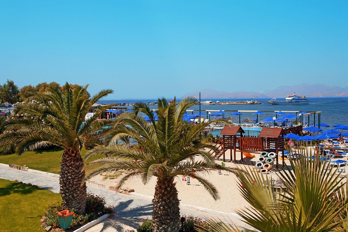 Mastichari Bay, hotelowa, piaszczysta ze skałkami, zalecane obuwie ochronne, drewniana platforma ułatwiająca zejście do morza, bezpośrednio przy hotelu, bezpłatne parasole i leżaki, ręczniki płatne (ok. 3 EUR/tydz.).