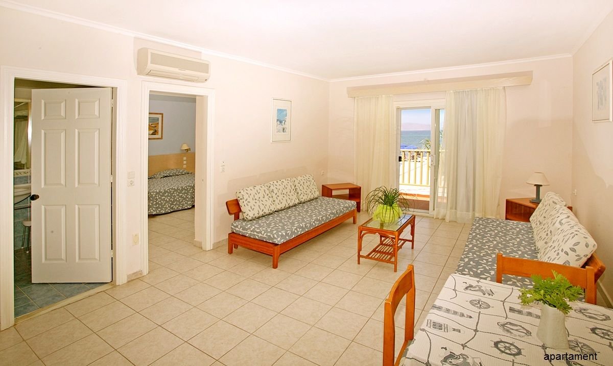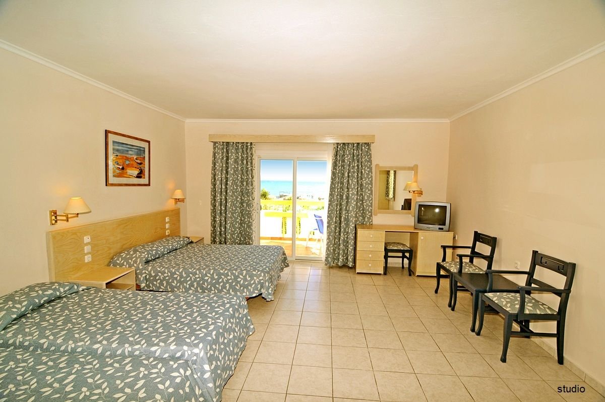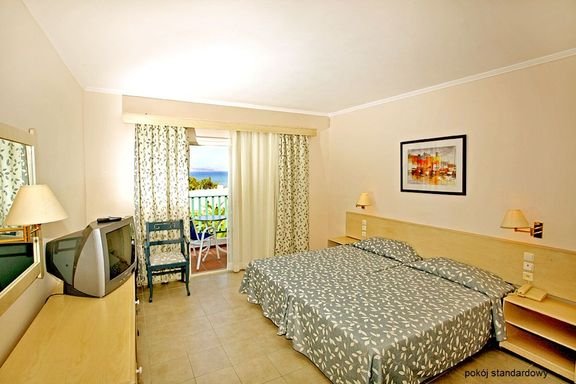 standardowy: 2-os. (możliwość 1 dostawki), ok. 25-28 m², indywidualnie sterowana klimatyzacja, łazienka (prysznic, wc; suszarka), telewizja satelitarna, polski program, telefon, lodówka, sejf (płatny: ok. 20 EUR/tydz.); bezpłatne łóżeczko dla dziecka do 2 lat na zamówienie przed przyjazdem; balkon, taras lub ogródek (stolik i krzesełka), widok na ogród; widok na morze za dopłatą; studio: 2-os. (możliwość 2 dostawek), ok. 30-34 m², wyposażony aneks kuchenny, wyposażenie jak w pokoju standardowym; balkon, taras lub ogródek (stolik i krzesełka), widok na ogród; apartament: maks. dla 5 os., ok. 45 m², osobna sypialnia i wyposażona kuchnia, wyposażenie jak w pokoju standardowym; balkon, taras lub ogródek, widok na ogród.