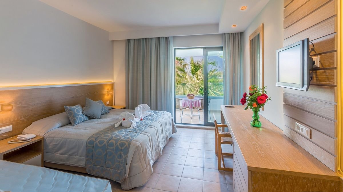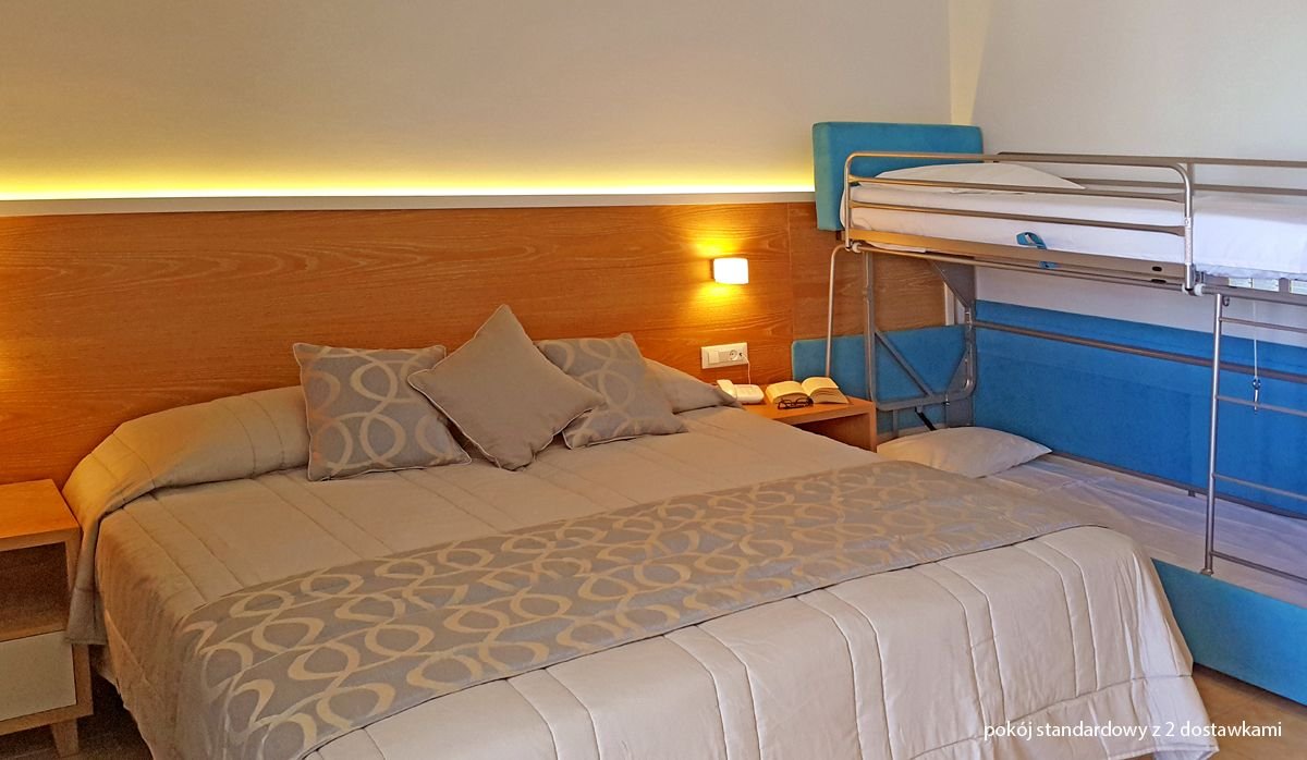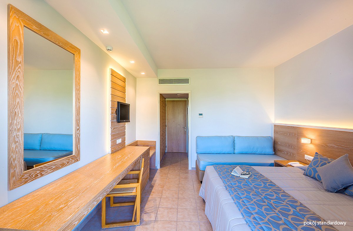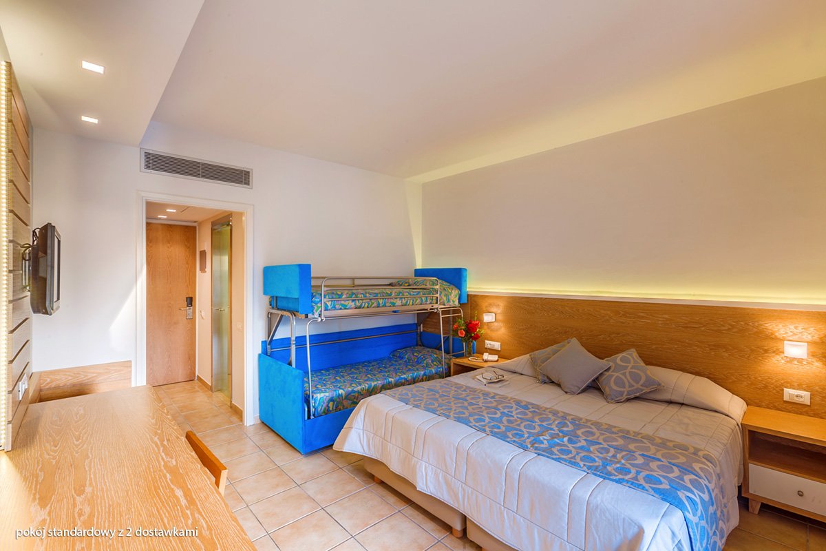standardowy: 2-os. (możliwość 1 lub 2 dostawek dla dzieci; łóżko piętrowe), ok. 24 m², klimatyzowany (w terminie: 01.06-13.09), łazienka (wanna lub prysznic, wc; suszarka), internet bezprzewodowy, telewizja satelitarna, telefon, lodówka; bezpłatne łóżeczko dla dziecka do 2 lat na zamówienie przed przyjazdem; balkon (stolik i krzesełka), widok na ogród lub basen.