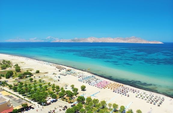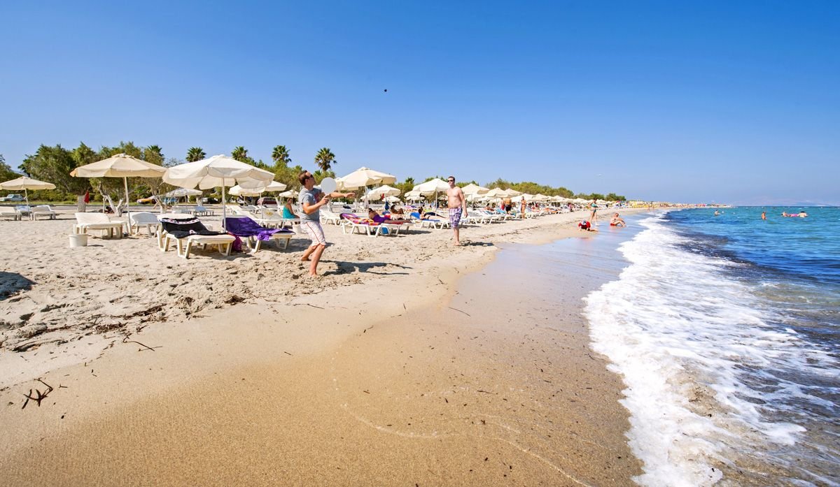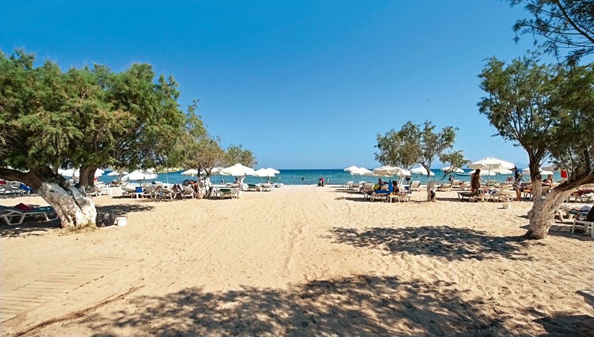 Tigaki, publiczna, piaszczysta, łagodne zejście do morza, ok. 100 m od hotelu, dojście chodnikiem, parasole i leżaki płatne (ok. 7 EUR/komplet: 2 leżaki i parasol).
