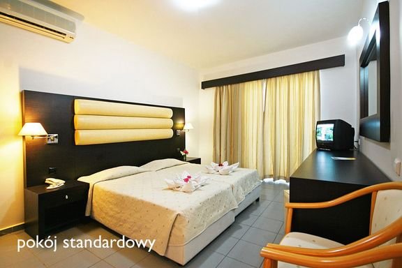 standardowy: 2-os. (możliwość 1 dostawki), ok. 20 m², indywidualnie sterowana klimatyzacja, łazienka (wanna, wc; suszarka), telewizja satelitarna, polski program, telefon, lodówka; za opłatą: sejf (ok. 30 EUR/tydz.), internet bezprzewodowy (ok. 5 EUR/3 dni); bezpłatne łóżeczko dla dziecka do 2 lat na zamówienie przed przyjazdem; balkon lub taras (stolik i krzesełka), widok na ogród lub basen; rodzinny: 2-os. (możliwość 1 lub 2 dostawek), ok. 30 m², 2 pomieszczenia oddzielone ścianą z drzwiami i oknem z żaluzją, wydzielona część dla dzieci z 2 sofami, wyposażenie jak w pokoju standardowym; pokój rodzinny za dopłatą.