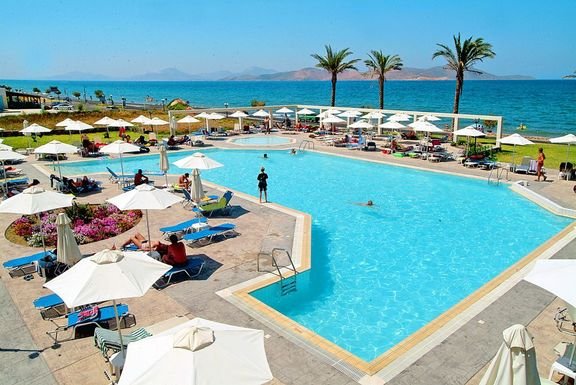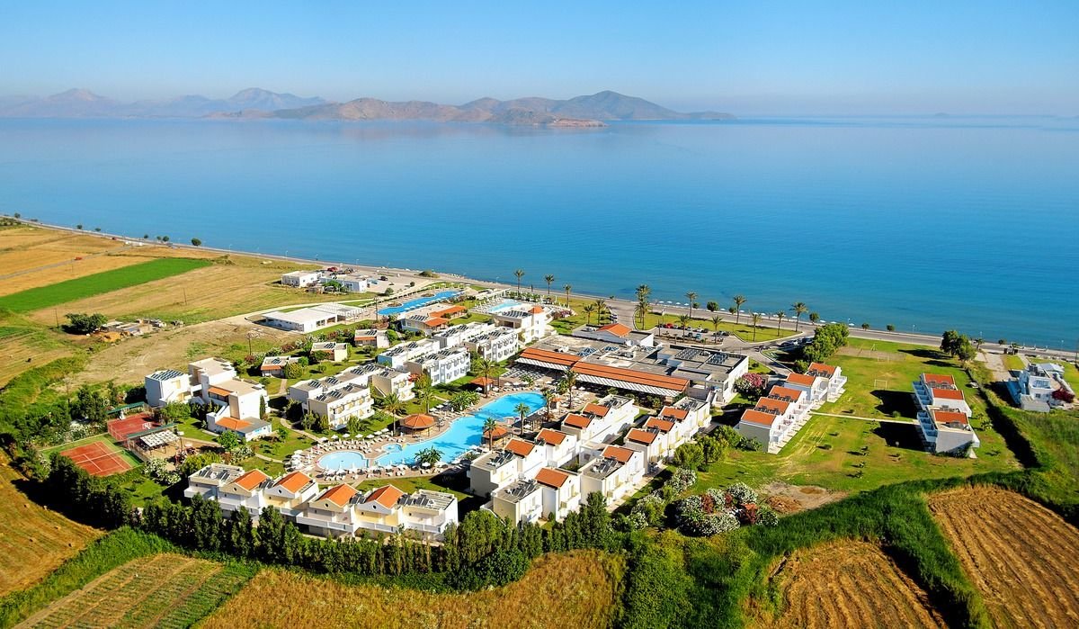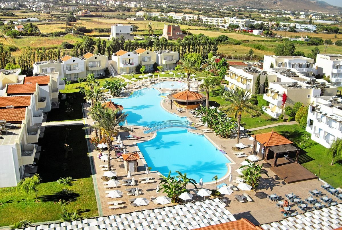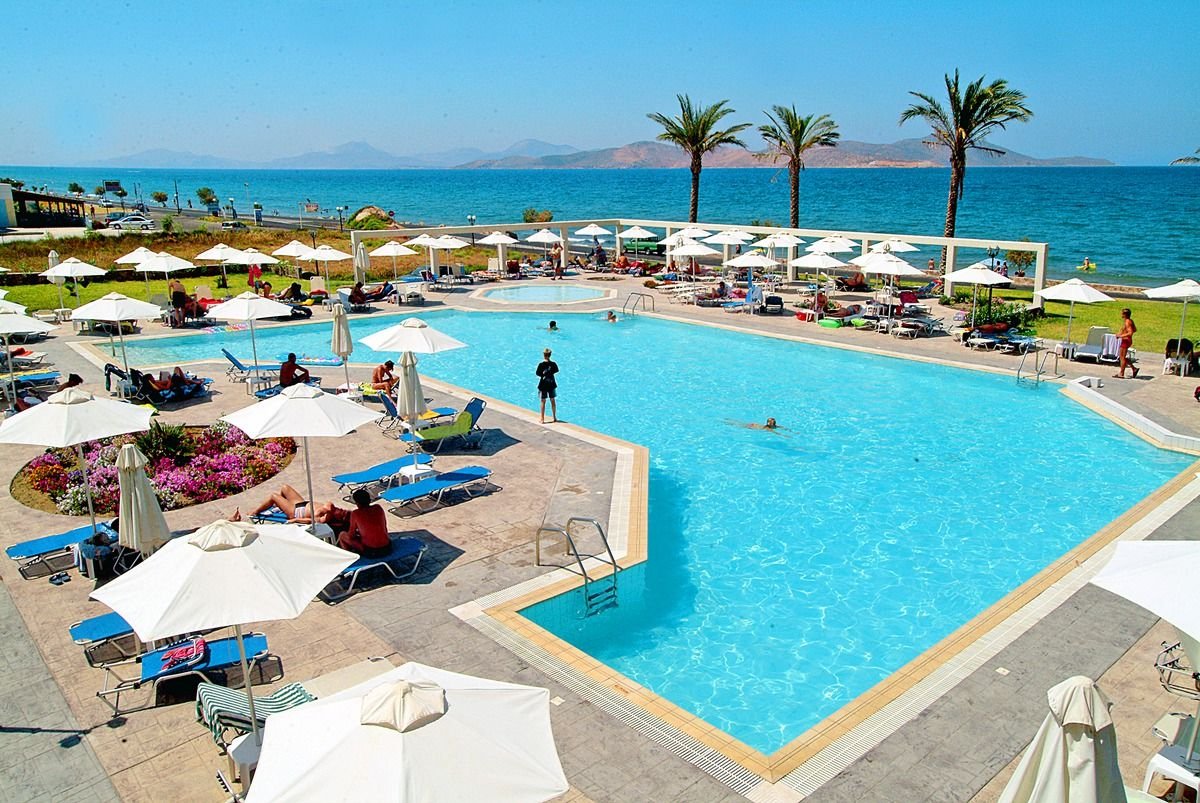 w dzielnicy hotelowej Tigaki, ok. 1,5 km od centrum TIGAKI, ze sklepami, restauracjami i barami; ok. 23 km od portu lotniczego na Kos; przystanek autobusowy ok. 50 m od hotelu (ok. 2 EUR/Kos).