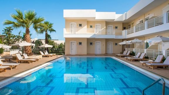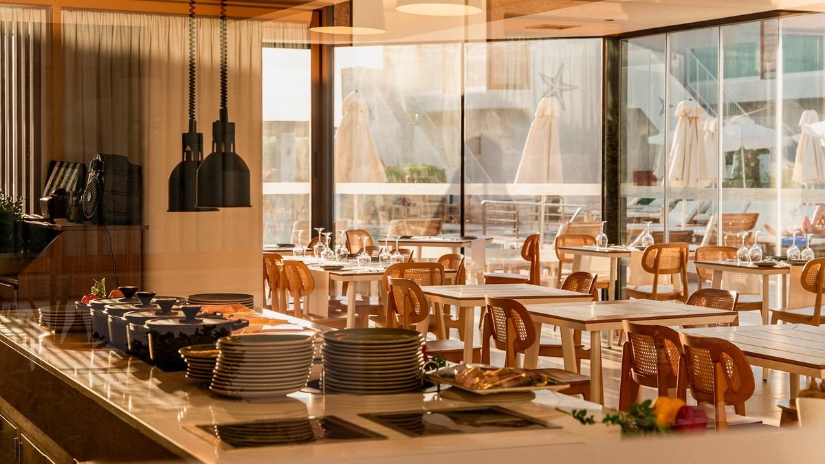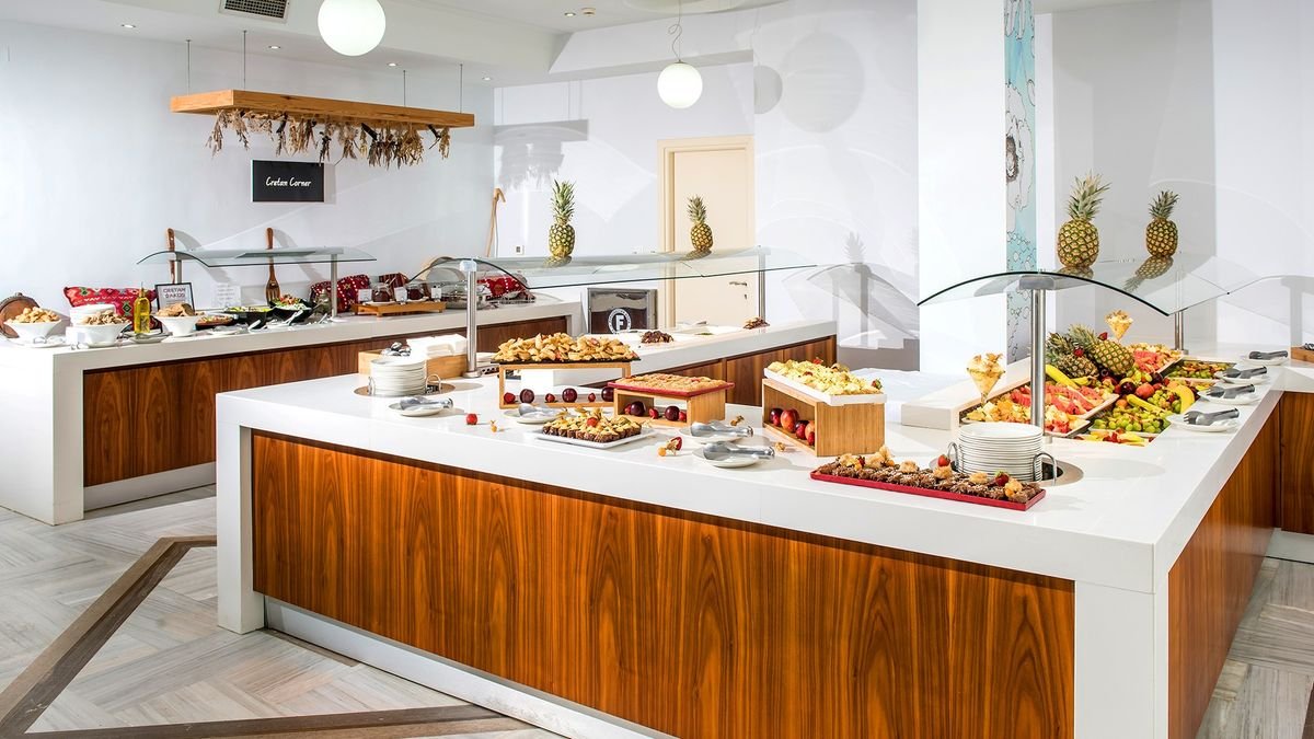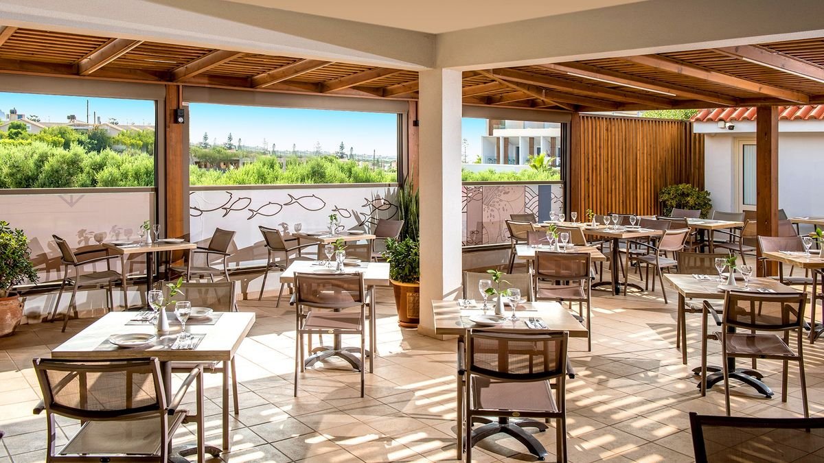 2 restauracje: główna Erontas – dania w formie bufetu, kuchnia lokalna i międzynarodowa, wieczory tematyczne, show cooking, dostępne menu i foteliki dla dzieci, dania wegetariańskie, inne diety na zamówienie, Kritamos – à la carte, kuchnia grecka