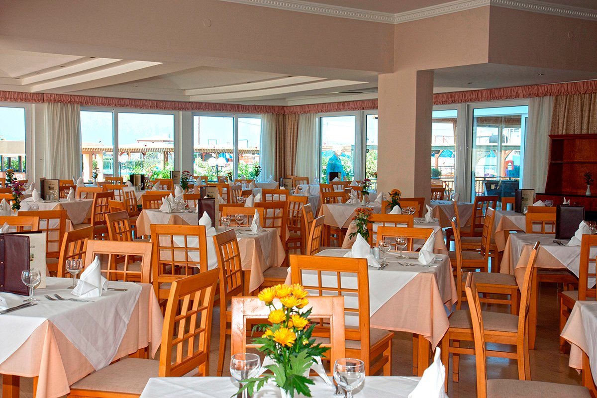 śniadanie (7.15-9.30), późne śniadanie (9.30), obiad (12.30-14.00), kolacja (19.00-21.30) w formie bufetu w restauracji głównej; przekąski (11.00-12.00; 15.00-16.00); kawa, herbata i ciastka (16.00-17.00); napoje bezalkoholowe: ciepłe i chłodzące; lokalne napoje alkoholowe: piwo, wino, rakija, ouzo, brandy, drinki na bazie ginu, wódki, rumu w barze głównym (10.00-23.00); wymagane noszenie opasek all inclusive.