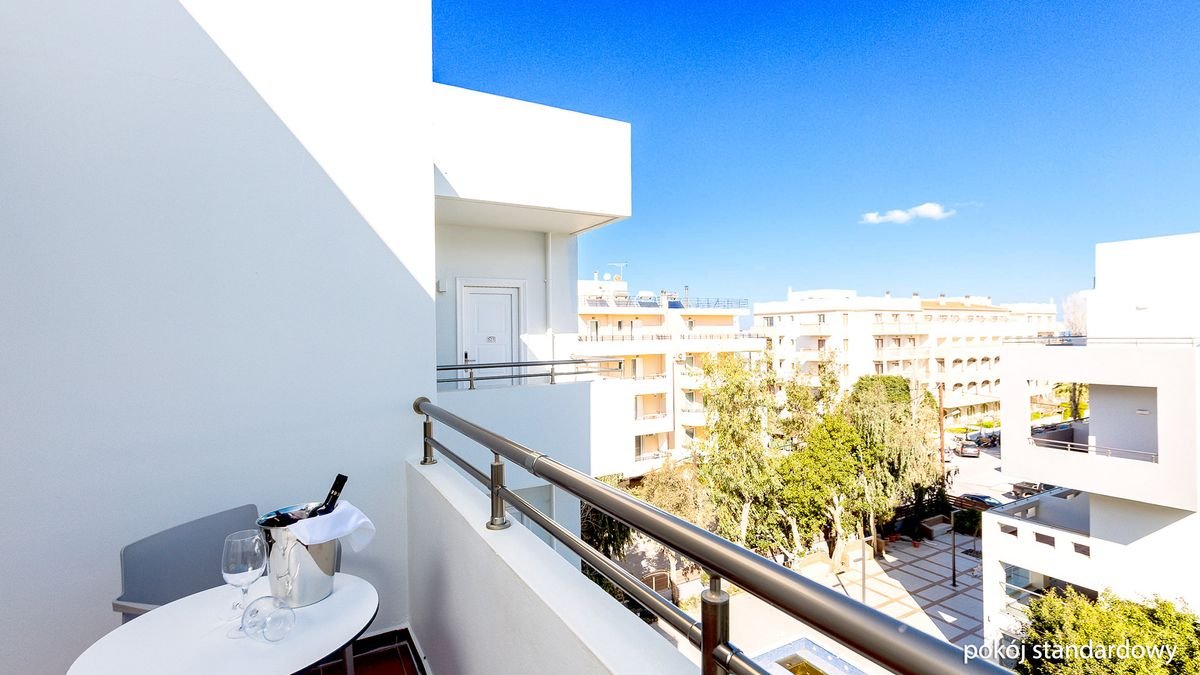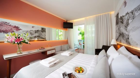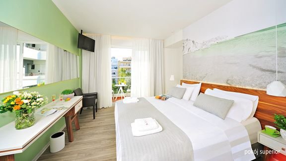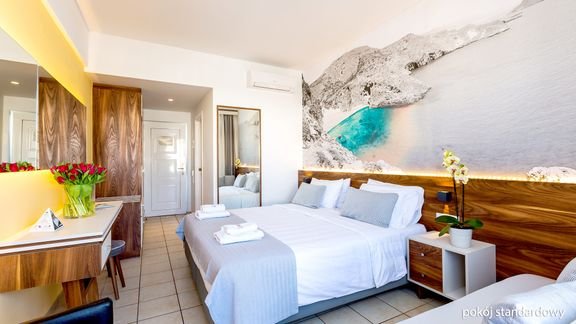 standardowy: 2-os. (możliwość 1 dostawki – sofa), ok. 20-23 m², odnowiony, indywidualnie sterowana klimatyzacja, łazienka (prysznic, wc; suszarka), internet bezprzewodowy, telewizor, telefon, lodówka, sejf (płatny: ok. 2,5 EUR/dzień); balkon lub taras (stolik i krzesełka); superior: 2-os. (możliwość 1 dostawki – sofa), ok. 23 m², odnowiony, elegancki i nowoczesny, wyposażenie jak w pokoju standardowym, dodatkowo zestaw do kawy/herbaty; pokój superior za dopłatą.