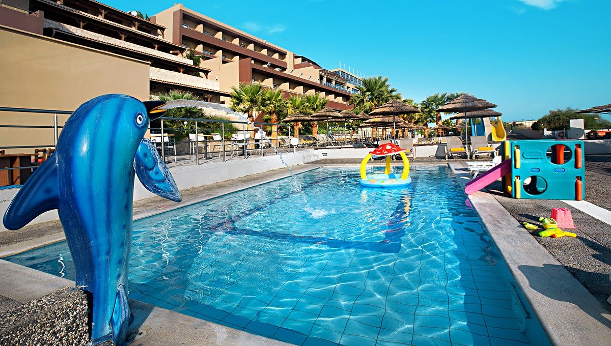 6 basenów: 4 baseny dla dorosłych, 2 baseny dla dzieci, 2 zjeżdżalnie dla dzieci, w tym: basen, nieregularny kształt, słodka woda, ok. 140 m², gł. 0,5-1,7 m, słodka woda, przy basenach bezpłatne parasole i leżaki, ręczniki płatne; kort tenisowy, minisiłownia, koszykówka, piłka nożna, minigolf, tenis stołowy; miniklub (5-12 lat), amfiteatr, animacje dla dorosłych, nastolatków i dzieci (w terminie: 15.06-15.09); za opłatą: bilard, centrum spa „4 SEASON”: basen kryty, słodka woda, sauna, hammam, zabiegi na twarz i ciało, manicure, pedicure, masaże; na plaży sporty wodne, szkoła nurkowania (oferta zewnętrzna).
