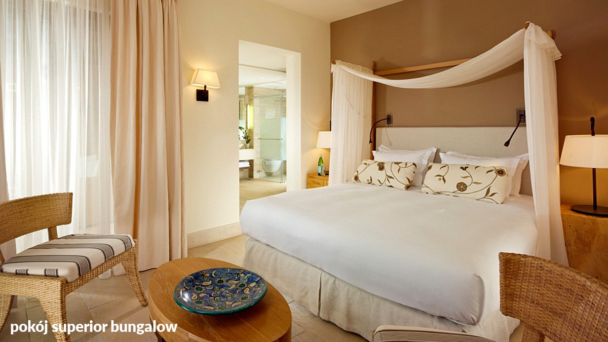 superior bungalow: 2-os. (możliwość 1 dostawki), ok. 40 m², indywidualnie sterowana klimatyzacja, łazienka (wanna, wc; suszarka, szlafroki, kapcie), telewizja satelitarna, telefon, sejf; za opłatą: internet bezprzewodowy, minibar (płatny wg. konsumpcji); bezpłatne łóżeczko dla dziecka do 2 lat na zamówienie przed przyjazdem, balkon (stolik i krzesełka); frontalny widok na morze.