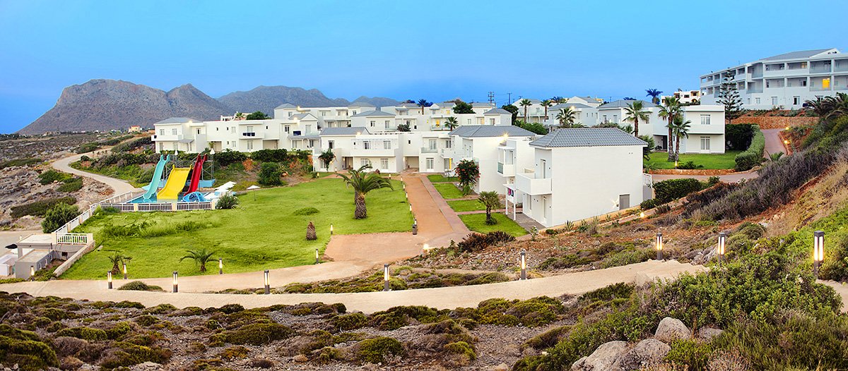 na półwyspie Akrotiri, w okolicach wioski Stavros, ok. 2 km od najbliższych sklepów, barów i restauracji, ok. 15 km od CHANII; ok. 10 km od portu lotniczego w Chanii, ok. 140 km od portu lotniczego w Heraklionie; przystanek autobusowy przy hotelu.