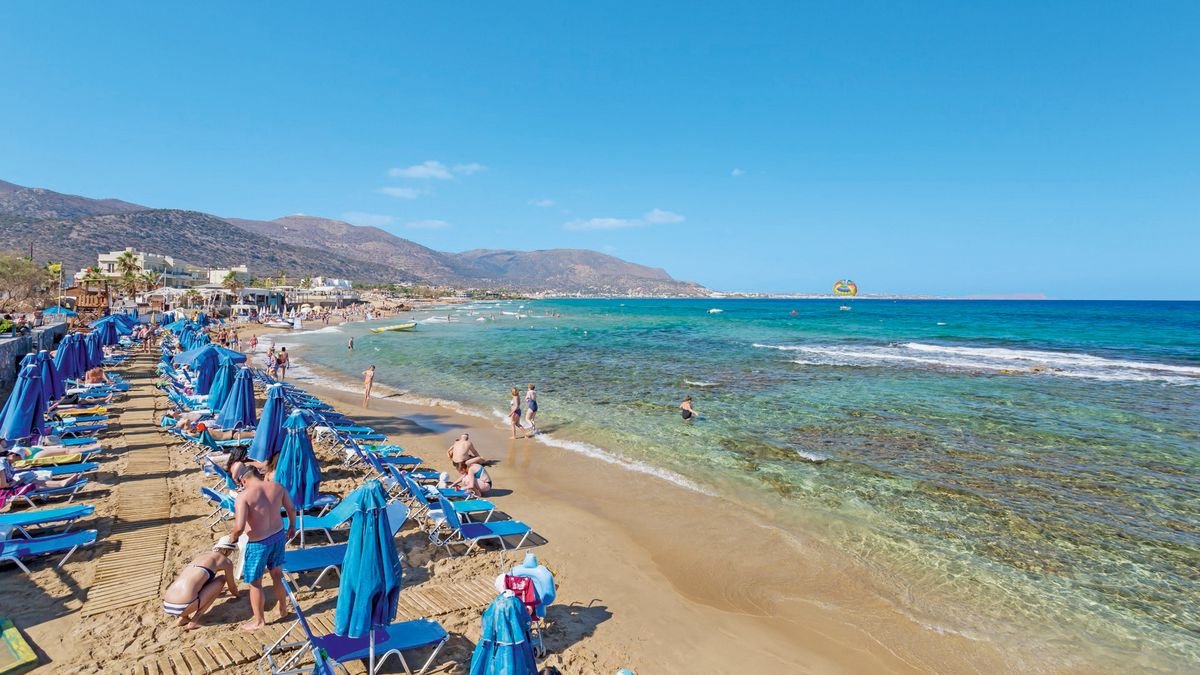 Malia, publiczna, piaszczysta, łagodne zejście do morza, bezpośrednio przy hotelu, bezpłatne parasole, leżaki i ręczniki (depozyt: ok. 10 EUR).