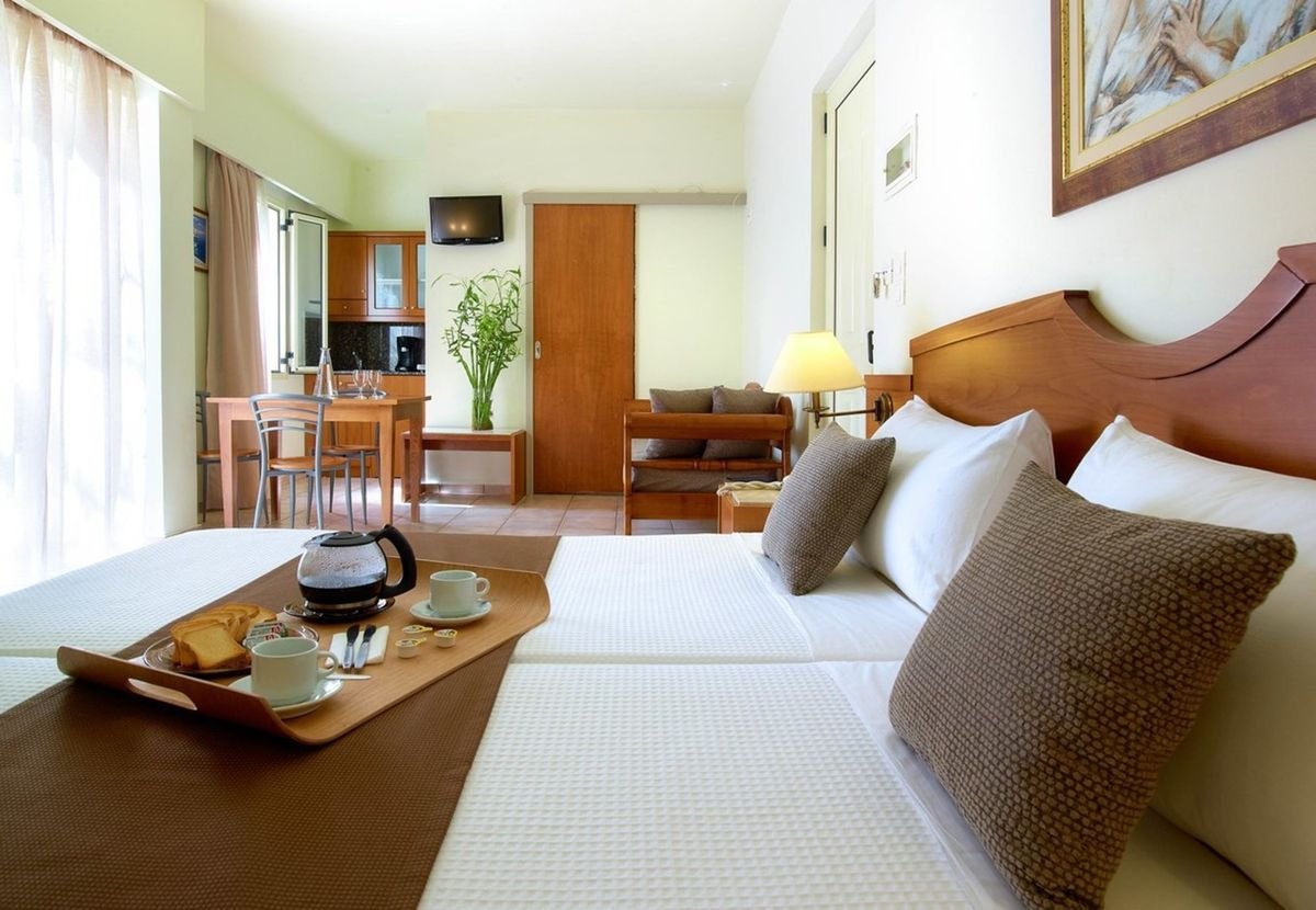studio: 2-os. (możliwość 1 dostawki), ok. 26 m2, indywidualnie sterowana klimatyzacja, łazienka (wanna lub prysznic, wc; suszarka, zestaw kosmetyków), telewizja satelitarna, wyposażony aneks kuchenny, zestaw do kawy/herbaty; za opłatą: internet bezprzewodowy, sejf (14 EUR/tydz.); bezpłatne łóżeczko dla dziecka do 2 lat na zamówienie przed przyjazdem; balkon lub taras (stolik i krzesełka), widok na ogród lub okolicę; superior: 2-os. (możwośc 1 dostawki), ok 22-30 m2, wyposażenie jak w studio, dodatkowo: bezpłatny internet bezprzewodowy; apartament z 1 sypialnią: 2-os. (możliwość 1 lub 2 dostawek), ok. 38 m2, sypialnia oraz oddzielony drzwiami pokój dzienny, wyposażenie jak w studio; junior suite: 2-os. (możliwość 2 dostawek), ok. 45 m2, sypialnia, na piętrze pokój dzienny, wyposażenie jak w studio; dodatkowo: bezpłatny internet bezprzewodowy, żelazko, deska do prasowania; pokoje: superior, apartament z 1 sypialnią i junior suite za dopłatą.