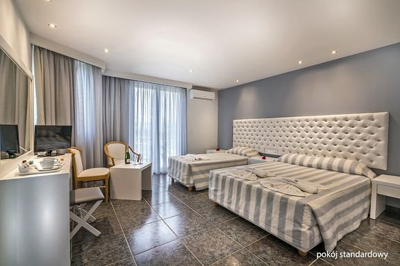 standardowy: 2-os. (możliwość 1 lub 2 dostawek dla dzieci), ok. 26 m², zadbany, indywidualnie sterowana klimatyzacja, łazienka (wanna, wc; suszarka), telewizja satelitarna, polski program, telefon, lodówka, sejf (ok. 14 EUR/tydz.); bezpłatne łóżeczko dla dziecka do 2 lat na zamówienie przed przyjazdem; balkon (stolik i krzesełka); rodzinny: 3-os. (możliwość 1 dostawki), ok. 40 m², 2 pokoje przedzielone drzwiami, wyposażenie jak w pokoju standardowym; pokój rodzinny na zamówienie, za dopłatą.