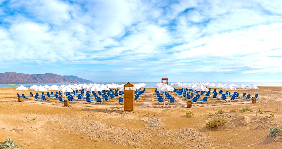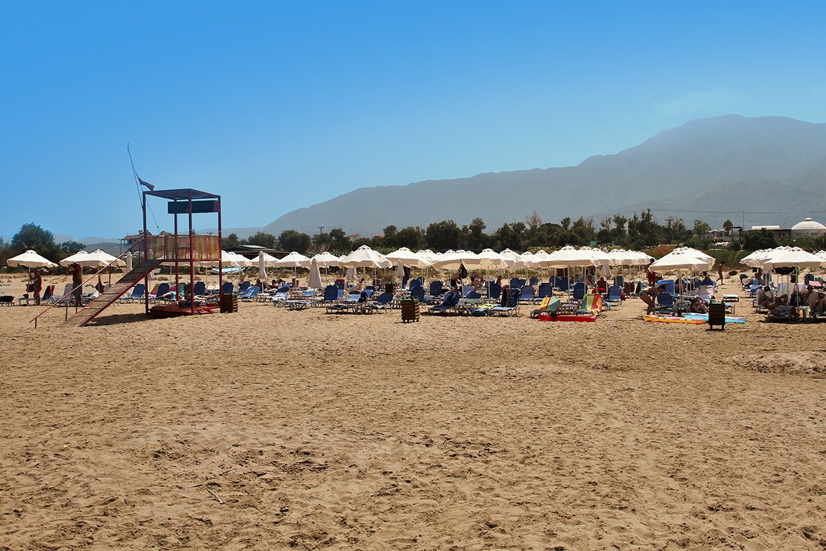 Kavros Beach, piaszczysta, łagodne zejście do morza, ok. 300 m od hotelu, przejście tunelem podziemnym, bezpłatne parasole i leżaki.