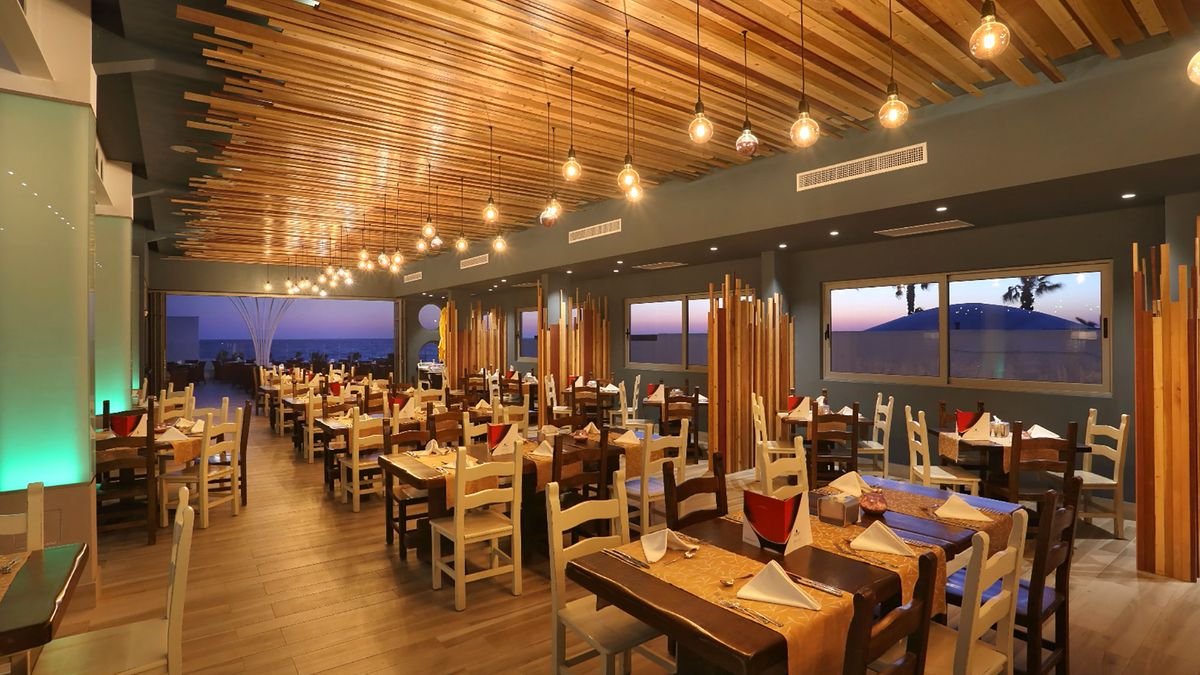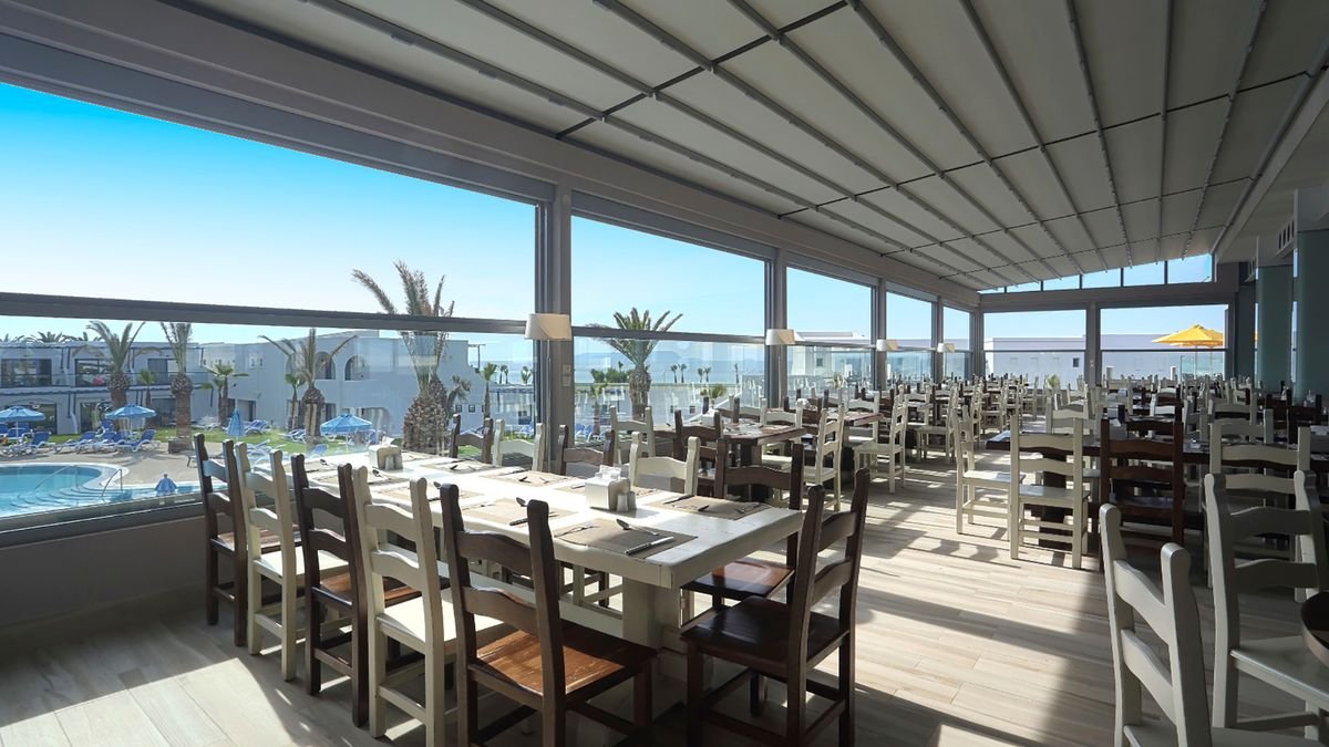 czterogwiazdkowy, nowoczesny, zbudowany w 1982 r., odnowiony w 2017 i 2018 r., 479 pokoi, kilka budynków, 2 piętra, przestronne lobby, całodobowa recepcja, 4 restauracje, dania w formie bufetu: restauracja główna Diktamo – kuchnia grecka i międzynarodowa, dostępne foteliki i menu dla dzieci, dania wegetariańskie, dieta bezglutenowa, Taverna Kalypso – kuchnia grecka i międzynarodowa, dostępne foteliki dla dzieci, Thalassa Snack Bar – dania z grilla, dostępne foteliki dla dzieci, Asian – kuchnia azjatycka, dostępne foteliki dla dzieci, 4 bary, w tym na plaży i przy basenie; kantor, minimarket, jubiler, sala konferencyjna dla 350 osób, taras z widokiem na baseny i morze, bezpłatny internet bezprzewodowy, punkt internetowy; za opłatą: opiekunka do dziecka (na zamówienie), pralnia; udogodnienia dla niepełnosprawnych; akceptowane karty kredytowe: Visa, MasterCard, American Express, Diners Club.