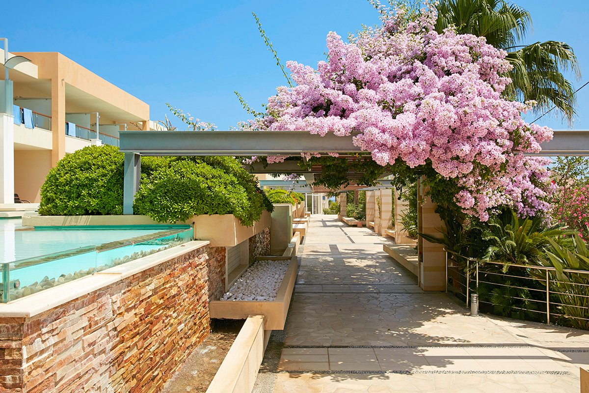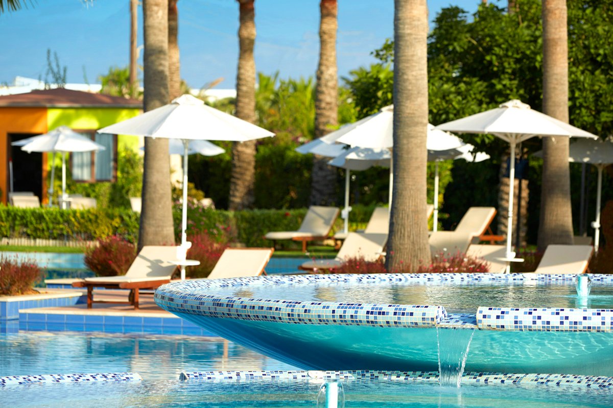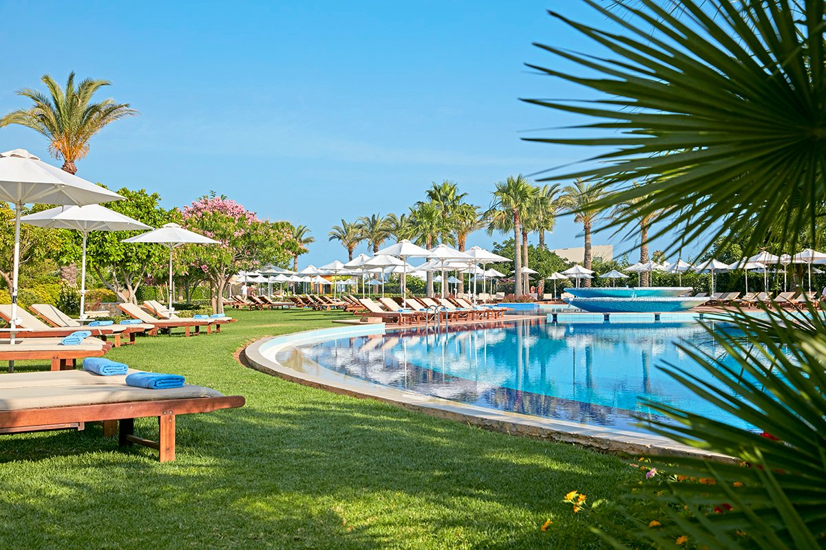 pięciogwiazdkowy, luksusowy i nowoczesny, zbudowany w 2002 r., rozbudowany i odnowiony w 2008 r., 254 pokoje, 2 budynki, 2 piętra, 8 wind, przestronne, eleganckie lobby, całodobowa recepcja, restauracja Elia – dania w formie bufetu, kuchnia międzynarodowa, dostępne foteliki i menu dla dzieci, dieta bezglutenowa (na zapytanie), restauracja Ta Nissia – á la carte, kuchnia włoska, dostępne foteliki dla dzieci, restauracja Thalassa przy plaży – á la carte, kuchnia śródziemnomorska, restauracja Galazio przy plaży – á la carte, tylko dla dorosłych, 5 barów: w lobby, 2 przy basenie, przy plaży, w ogrodzie; minimarket, jubiler, kantor, parking, taras z widokiem na morze, ogród; centrum konferencyjne dla 600 osób; bezpłatny internet bezprzewodowy; za opłatą: opiekunka do dziecka, pralnia; akceptowane karty kredytowe: Visa, MasterCard, American Express, Diners Club.