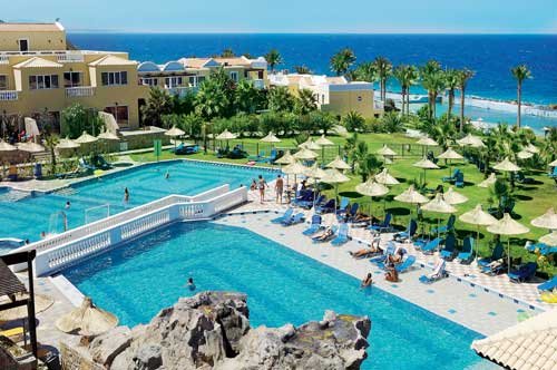 pięciogwiazdkowy, greckiej kategorii deluxe, zbudowany w 2001 r., odnowiony w 2009 r., 338 pokoi, budynek główny, 3 windy, rozległy kompleks bungalowów wkomponowanych we wzgórze; przestronne i eleganckie lobby, całodobowa recepcja, restauracja główna "Grand Blue" - dania w formie bufetu, dostępne foteliki i menu dla dzieci, dania wegetariańskie, wieczorki tematyczne, show cooking, 4 restauracje à la carte: "Laguna" - włoska, "Jasmine" - chińska, "Gourmet" - ryby i owoce morza, VIP Veranda (część restauracji czynna od połowy czerwca do połowy października); bary: "Tropical", "Sea Side" w pobliżu morza, "Theatre" przy pasażu handlowym, "Cascade", "Veranda", kącik telewizyjny, mini-market, sklep z pamiątkami, butik, jubiler; sala konferencyjna dla 350 osób, taras z widokiem na morze, duży ogród z roślinnością śródziemnomorską; za opłatą: punkt Internetowy i Internet bezprzewodowy (ok. 6 EUR/godz.), room-service, lekarz na wezwanie, wypożyczalnia samochodów, pralnia; z uwagi na położenie, różnice poziomów i schody hotel nie jest polecany dla osób z ograniczeniami ruchowymi; akceptowane karty kredytowe: Visa, Mastercard, American Express.