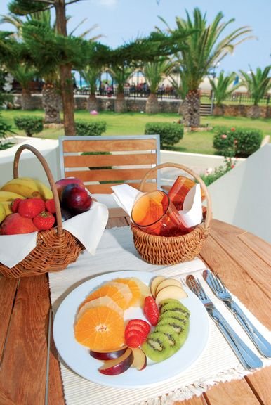 śniadanie (7.30-10.30), obiad w restauracji hotelu Minos Mare (12.30-14.00), kolacja (18.30-21.00) w formie bufetu w restauracji głównej; przekąski i lody w barze przy basenie (11.00-18.30); napoje bezalkoholowe i lokalne napoje alkoholowe w barze przy basenie (11.00-18.30) lub barze w lobby (18.30-23.00); wymagane noszenie opasek all inclusive.