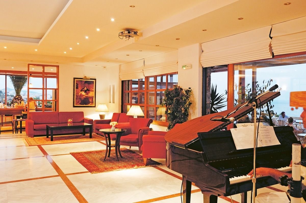 czterogwiazdkowy, nowoczesny i zadbany, częściowo odnowiony w 2010 r., łącznie 310 pokoi o różnej typologii, 3 budynki (Miramare Hotel) i kompleks bungalowów (Miramare Village) oraz nowa pięciogwiazdkowa część Villas; 1-4 piętra, kaskadowa zabudowa, 5 wind, przestronne lobby, całodobowa recepcja, restauracja Bellavista – dania w formie bufetu, kuchnia lokalna i międzynarodowa, obowiązuje strój formalny (panowie – długie spodnie), Aeolos przy basenie – à la carte, kuchnia lokalna i międzynarodowa, obowiązuje strój formalny (panowie – długie spodnie), Aegeon przy basenie – à la carte, kuchnia międzynarodowa; w restauracjach dostępne foteliki dla dzieci; bar Palm Lounge w lobby, bar Aeolos przy basenie, bar przy basenie, minimarket; centrum konferencyjne dla 300 osób, taras z widokiem na morze, ogród, bezpłatny internet bezprzewodowy w lobby (1 GB/pobyt/pokój); za opłatą: internet bezprzewodowy (ok. 10 EUR/2GB), punkt internetowy (ok. 5 EUR/1,5 godz.), opiekunka do dziecka, lekarz na wezwanie, pralnia; z uwagi na położenie na terenach hotelowych występują różnice poziomów i schody – nie polecany osobom z ograniczeniami ruchowymi; akceptowane karty kredytowe: Visa, American Express