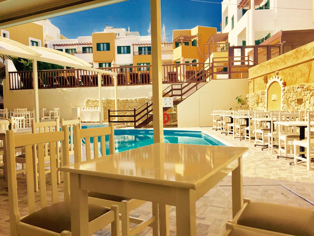 czterogwiazdkowy, zadbany, zbudowany w 1990 r., odnowiony w 2017 r., 240 pokoi, 14 budynków, 4 piętra, 1 winda, lobby, całodobowa recepcja, 3 restauracje: główna Porto Greco – dania w formie bufetu, kuchnia grecka i międzynarodowa, Porto Greco – á la carte, dostępne menu dla dzieci, Cyrrus przy plaży – á la carte, dostępne menu dla dzieci; w restauracjach dostępne foteliki dla dzieci, dania wegetariańskie, 3 bary: przy basenie, Cyrrus przy plaży oraz bar Porto Greco; punkt wymiany walut, minimarket; bezpłatny internet bezprzewodowy; za opłatą: punkt internetowy (ok. 2 EUR/godz.), sejf w recepcji (ok. 3 EUR/dzień), room-service, opiekunka do dziecka, lekarz na wezwanie, pralnia; występują różnice poziomów i schody – nie jest polecany osobom z ograniczeniami ruchowymi; akceptowane karty kredytowe: Visa i MasterCard.
