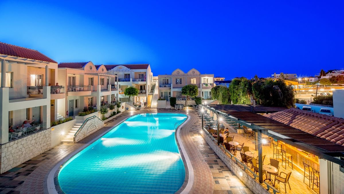 w KATO DARATSO, ok. 3 km od centrum Chanii, ok. 50 m od drogi lokalnej, ok. 5 km od Agia Marina i Platanias, sklepy i restauracje ok. 500 m od hotelu; ok. 23 km od lotniska w Chanii, ok. 140 km od lotniska w Heraklionie; przystanek autobusowy przed hotelem (centrum Chanii).