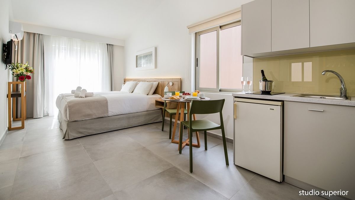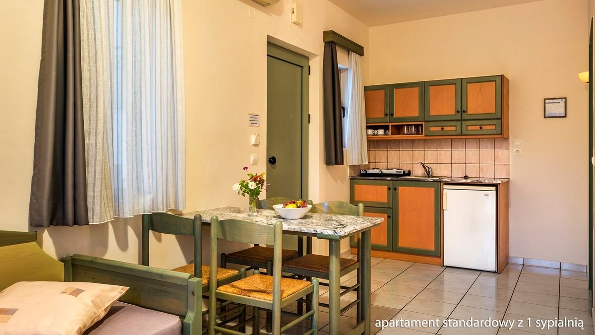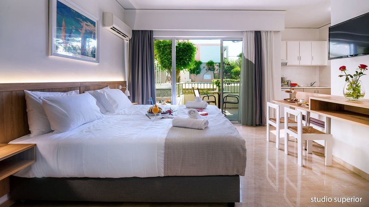 studio superior: 2-os., eleganckie, ok. 23 m², indywidualnie sterowana klimatyzacja, łazienka (wanna lub prysznic, wc; suszarka), internet bezprzewodowy, telewizja satelitarna, telefon, lodówka, zestaw do kawy/herbaty, aneks kuchenny, bezpłatne łóżeczko dla dziecka do 2 lat na zamówienie przed przyjazdem; balkon (stolik i krzesełka; suszarka), widok na ogród; apartament standardowy z 1 sypialnią: dla maks. 4 osób, ok. 32 m²; wyposażenie jak w studio superior; pokój dzienny i sypialnia oddzielone drzwiami, balkon lub taras (stolik i krzesełka; suszarka); widok na ogród; apartament za dopłatą.