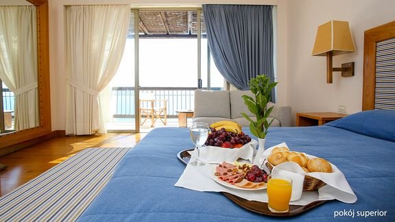 superior: (możliwość 1 dostawki), ok. 30 m2, klimatyzowany, łazienka (wanna lub prysznic, wc; suszarka), internet bezprzewodowy, telewizja satelitarna, telefon, sejf, minibar (płatny wg konsumpcji); bezpłatne łóżeczko dla dziecka do 2 lat na zamówienie przed przyjazdem; balkon (stolik i krzesełka), widok na morze.