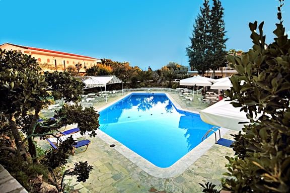 trzygwiazdkowy, zadbany, zbudowany w 1986 r., odświeżony w 2015 r., 62 pokoje, 5 budynków, 1 piętro, małe lobby, całodobowa recepcja, restauracja Palatino – dania w formie bufetu, kuchnia grecka, tawerna na plaży – á la carte (dodatkowo płatna), bar w lobby, bar przy basenie, bar na plaży; w restauracjach dostępne foteliki dla dzieci, dania wegetariańskie; taras z widokiem na morze, ogród, bezpłatny internet bezprzewodowy, punkt internetowy; za opłatą: sejf w recepcji (ok. 2 EUR/dzień), wypożyczalnia samochodów; akceptowane karty kredytowe: Visa, MasterCard, American Express, Diners Club.