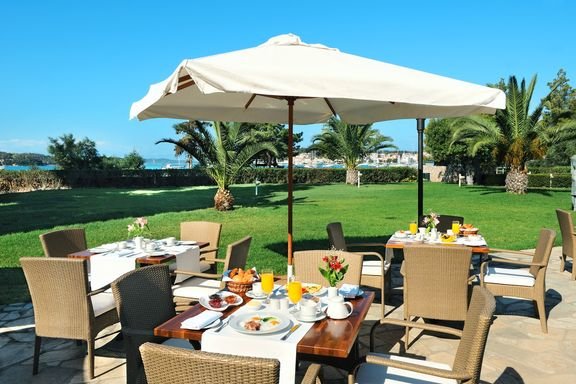 śniadanie (7.30-10.30), obiad (13.00-15:00) kolacja (19.30-21.00) w formie bufetu w restauracji Mycenae; przekąski w restauracji Mycenae (10.30-13.00, 15.00-18.00); napoje bezalkoholowe i lokalne napoje alkoholowe soft (piwo, wino) w barze przy basenie (10.00-18.00) i w barze Electra (18.00-23.00).
