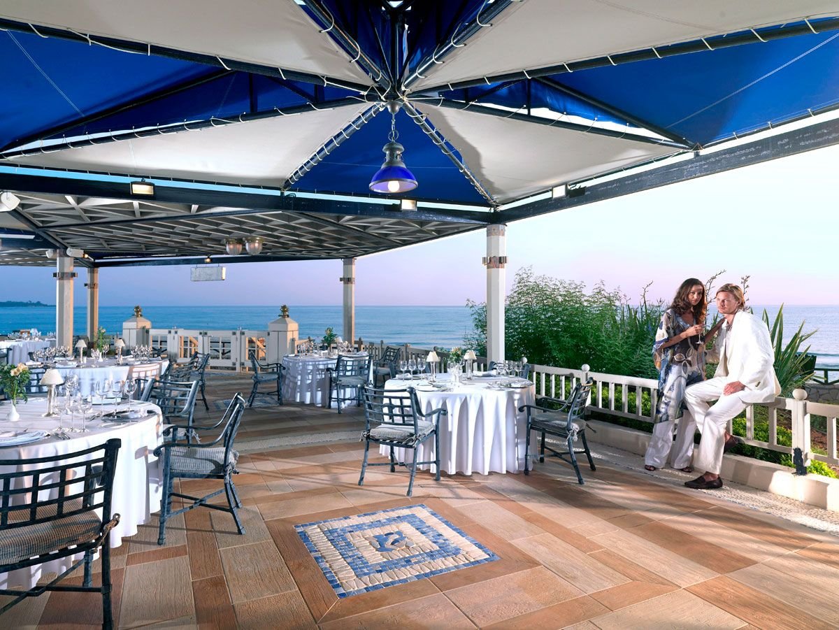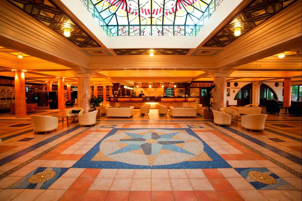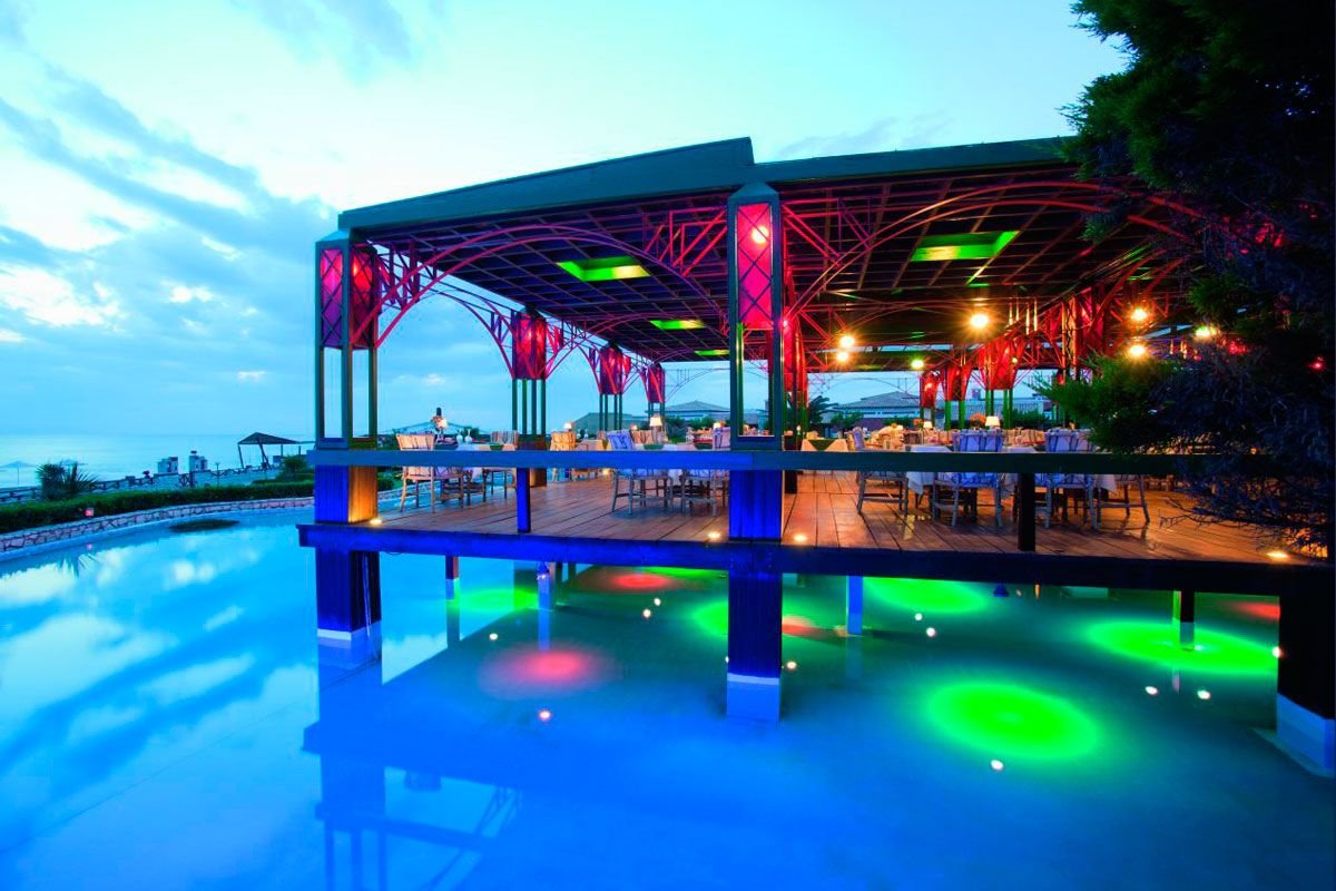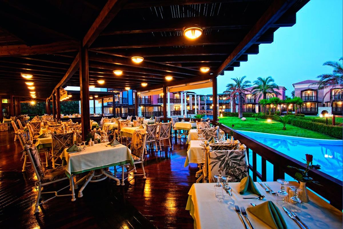 pięciogwiazdkowy, stylowy, należy do kompleksu Royal Olympian Spa & Thalasso, zbudowany w 1999 r., sezonowo odnawiany, 356 pokoi, budynek główny i bungalowy, 2 piętra, 2 windy, przestronne i eleganckie lobby, całodobowa recepcja, restauracja główna Olympia – dania w formie bufetu, kuchnia grecka i międzynarodowa, dostępne foteliki i menu dla dzieci, wymagany odpowiedni strój (panowie - długie spodnie), na terenie kompleksu: 2 restauracje à la carte (czynne sezonowo): Artemis – kuchnia włoska, Golden Palm – kuchnia chińska, wymagana wcześniejsza rezerwacja; 5 barów, w tym bary przy basenach i bar na plaży, kantor, mini-market, sklep z pamiątkami i odzieżą; centrum konferencyjne dla 400 osób, taras z widokiem na morze, ogród, bezpłatny internet bezprzewodowy; za opłatą: punkt internetowy, room-service (7.30-00.30), opiekunka do dziecka, fryzjer, pralnia, wypożyczalnia rowerów; akceptowane karty kredytowe: Visa, MasterCard, American Express, Diners Club.