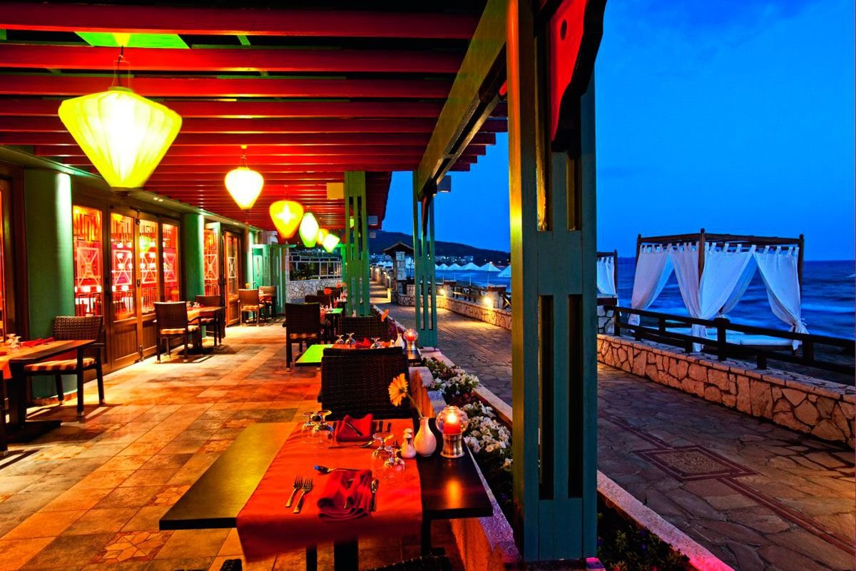 śniadanie (7.30-10.30), obiad (12.30-14.00) w wyznaczonym barze, kolacja (19.00-21.30) w formie bufetu w restauracji głównej; napoje bezalkoholowe i lokalne napoje alkoholowe w wyznaczonych barach (11.00-24.00); raz na tydzień kolacja w wybranej restauracji à la carte (kuchnia włoska lub chińska; wymagana wcześniejsza rezerwacja); wymagane noszenie opasek all inclusive.