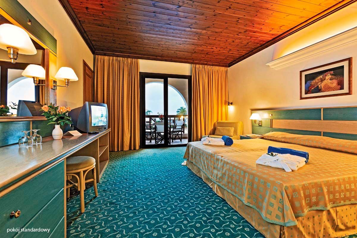 standardowy: 2-os. (możliwość 1 dostawki), ok. 26 m², komfortowy, klimatyzowany (15.06-15.09), łazienka (wanna, wc; suszarka, kapcie), internet bezprzewodowy, telewizja satelitarna, telefon, sejf, mini-bar (płatny); bezpłatne łóżeczko dla dziecka do 2 lat na zamówienie przed przyjazdem; balkon lub taras (stolik i krzesełka); widok na morze za dopłatą; apartament: 2-os. (możliwość 1 lub 2 dostawek), ok. 40 m², zadbany i praktycznie urządzony, wyposażenie jak w pokoju standardowym, dodatkowo aneks kuchenny; apartament na zapytanie, za dopłatą.