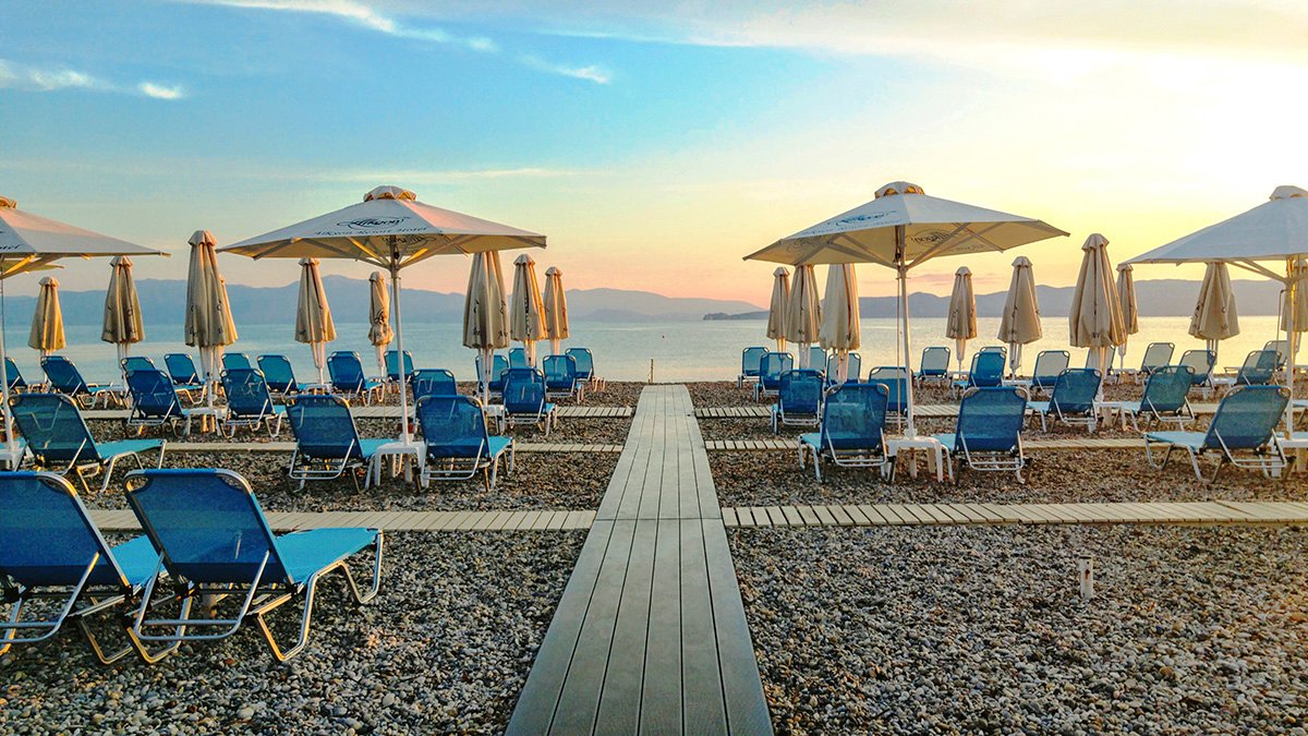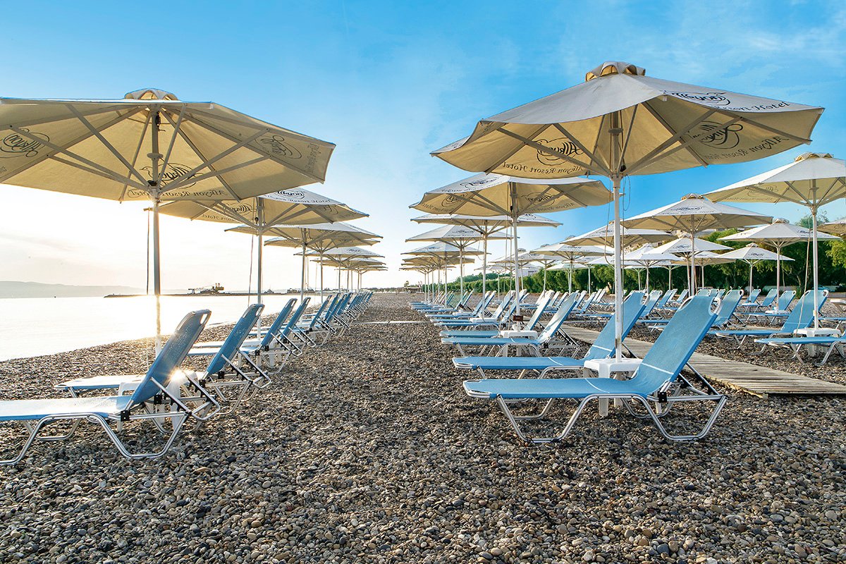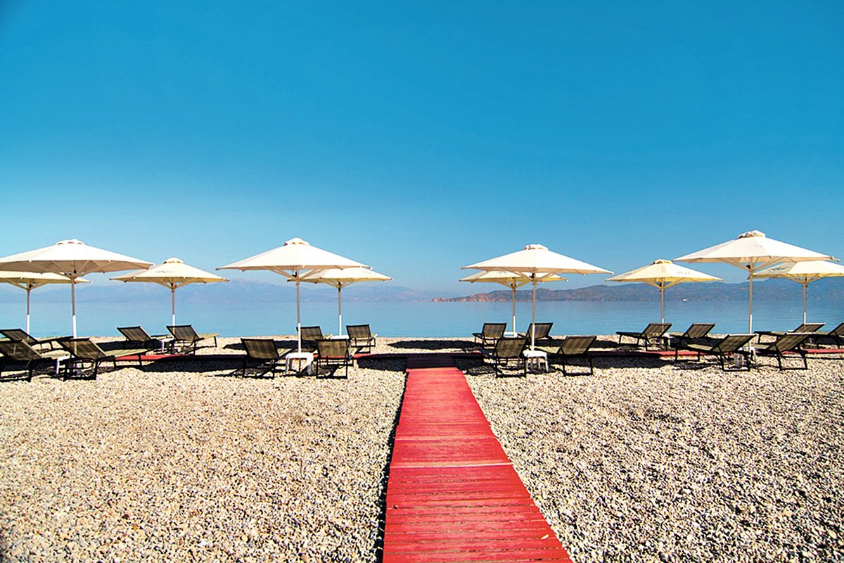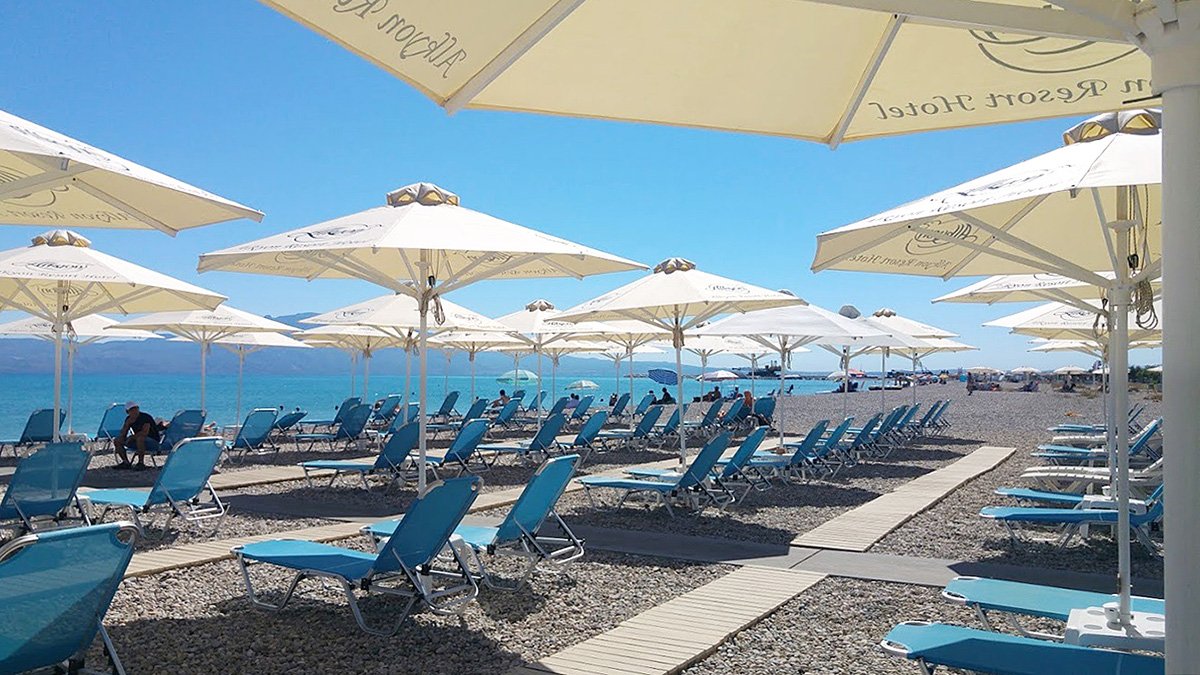 Vrahati, publiczna, kamienista, zalecane obuwie ochronne, łagodne zejście do morza, ok. 100 m od hotelu, dojście drogą, bezpłatne parasole i leżaki, ręczniki za kaucją (ok. 10 EUR).