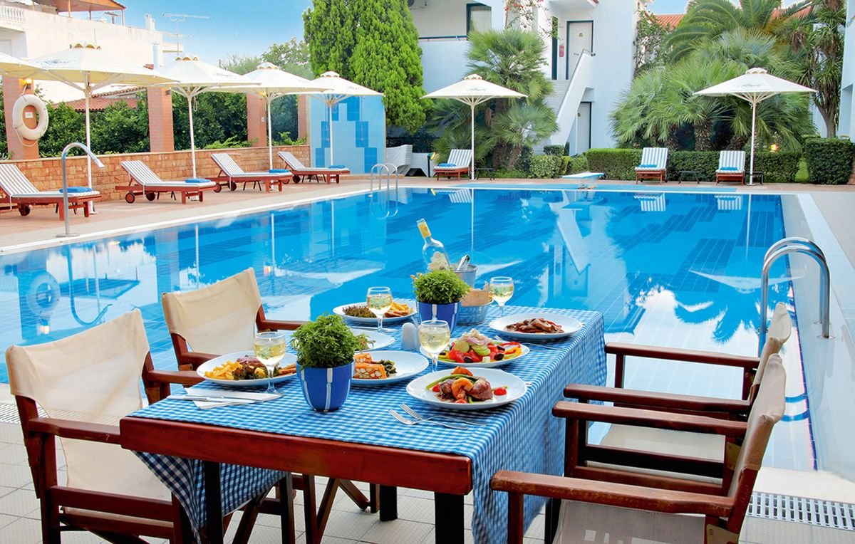 śniadanie (7.30-10.30), obiad (13.30-15.30), kolacja (19.30-21.30) w formie bufetu w restauracji; przekąski w barach (11.45-13.00, 16.00-17.00); napoje bezalkoholowe w barach i restauracji (7.30-23.00) i lokalne napoje alkoholowe w barach (11.00-23.00); wymagane noszenie opasek all inclusive.