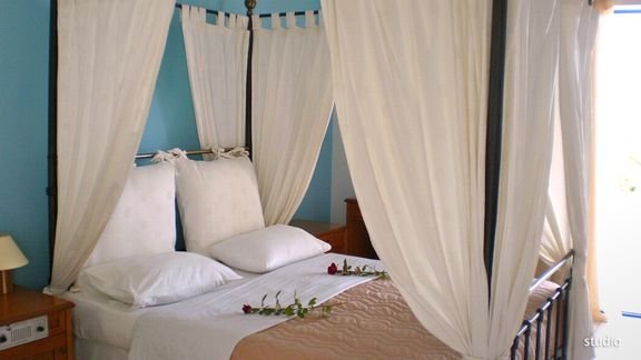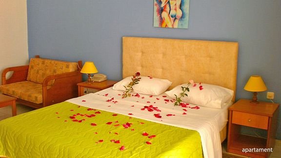 studio: 2-os. (możliwość 1 dostawki), ok. 28-34 m2, indywidualnie sterowana klimatyzacja, łazienka (wanna lub prysznic, wc; suszarka), aneks kuchenny, internet bezprzewodowy, telewizja satelitarna, telefon, lodówka; bezpłatne łóżeczko dla dziecka do 2 lat na zamówienie przed przyjazdem; balkon (stolik i krzesełka); apartament: 2-os. (możliwość 1 lub 2 dostawek - sofa), ok. 50-54 m2, łazienka (wanna, wc; suszarka), wyposażenie jak w studio; widok na ogród; apartament za dopłatą.