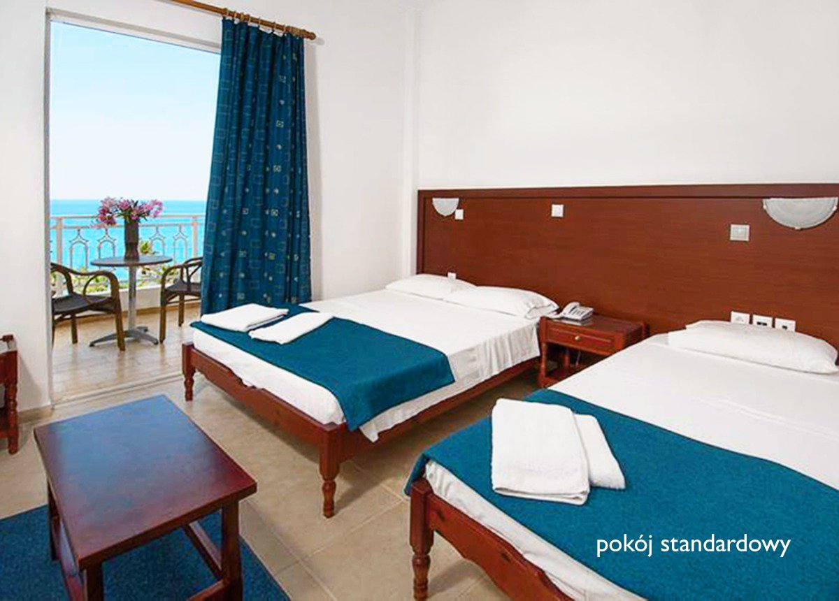 standardowy: 2-os. (możliwość 1 dostawki), ok. 20 m², zadbany, indywidualnie sterowana klimatyzacja (bezpłatna: czerwiec-wrzesień), łazienka (prysznic, wc; suszarka), telefon, lodówka; bezpłatne łóżeczko dla dziecka do 2 lat na zamówienie przed przyjazdem; balkon (stolik i krzesełka), widok na morze.