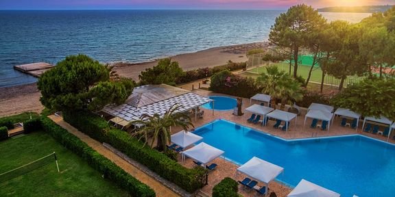 Słoneczny resort zaprasza na beztroskie rodzinne wakacje w otoczeniu śródziemnomorskiej przyrody. Położony w pierwszej linii brzegowej, tuż przy pięknej, szerokiej plaży z bezpłatnym serwisem, na której można prawdziwie odpocząć, a wieczorami podziwiać zachwycające zachody słońca. Mnóstwo możliwości spędzenia wolnego czasu – w hotelu jest duży basen, 4 korty tenisowe i wiele innych atrakcji. Dzieci mogą spędzić dzień na placu zabaw lub na zajęciach w miniklubie, a dla całej rodziny przygotowano animacje z wieczornymi przedstawieniami w amfiteatrze. W okolicy prawdziwa gratka dla wielbicieli historii – starożytne Nicopolis.