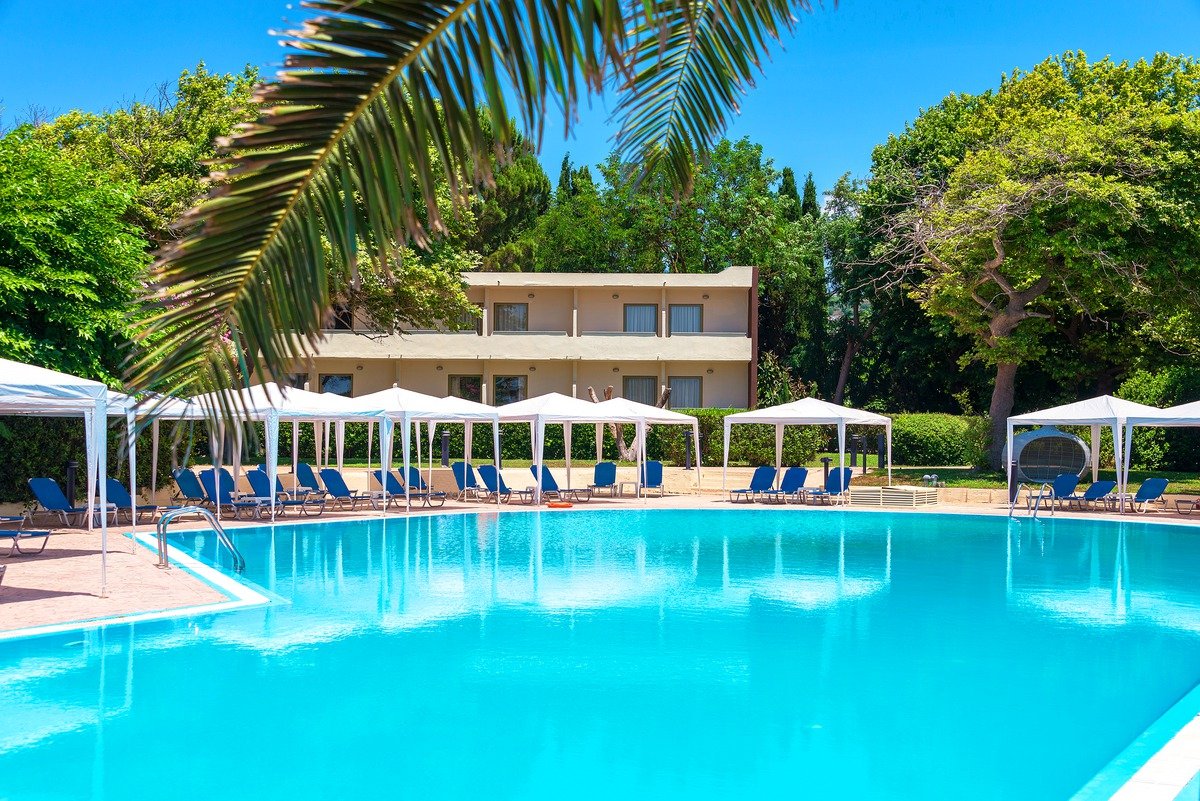 trzygwiazdkowy, zadbany, zbudowany w 1974 r., całkowicie odnowiony w 2011 r., 5 budynków: główny, 4 piętra, 4 boczne, 1 piętro, w budynku głównym: winda, przestronne lobby, całodobowa recepcja, restauracja La Terrace z widokiem na morze – dania w formie bufetu, kuchnia grecka i międzynarodowa, raz w tygodniu wieczór grecki, dostępne foteliki dla dzieci, dania wegetariańskie, bary: Ionian View, Aquarius przy basenie, bar na plaży, May Flower przed budynkiem głównym; minimarket, pokój na bagaże, budzenie na życzenie; centrum konferencyjne dla 400 osób, taras z widokiem na morze, śródziemnomorski ogród, bezpłatny internet bezprzewodowy; za opłatą: opiekunka do dziecka, pralnia; udogodnienia dla osób niepełnosprawnych: rampy, podjazdy; akceptowane karty kredytowe: Visa, MasterCard, American Express, Diners Club.