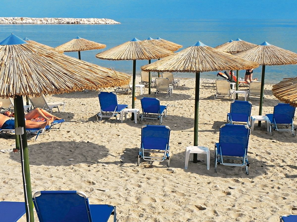 Kanali, hotelowa, szeroka, piaszczysto-żwirkowa, łagodne zejście do morza, bezpośrednio przy hotelu, bezpłatne parasole i leżaki, ręczniki za kaucją (ok. 10 EUR/ręcznik); Kastrossikia, publiczna, piaszczysta, łagodne zejście do morza, ok. 3 km od hotelu, dojście drogą asfaltową lub plażą, płatne parasole i leżaki (ok. 5 EUR/komplet).