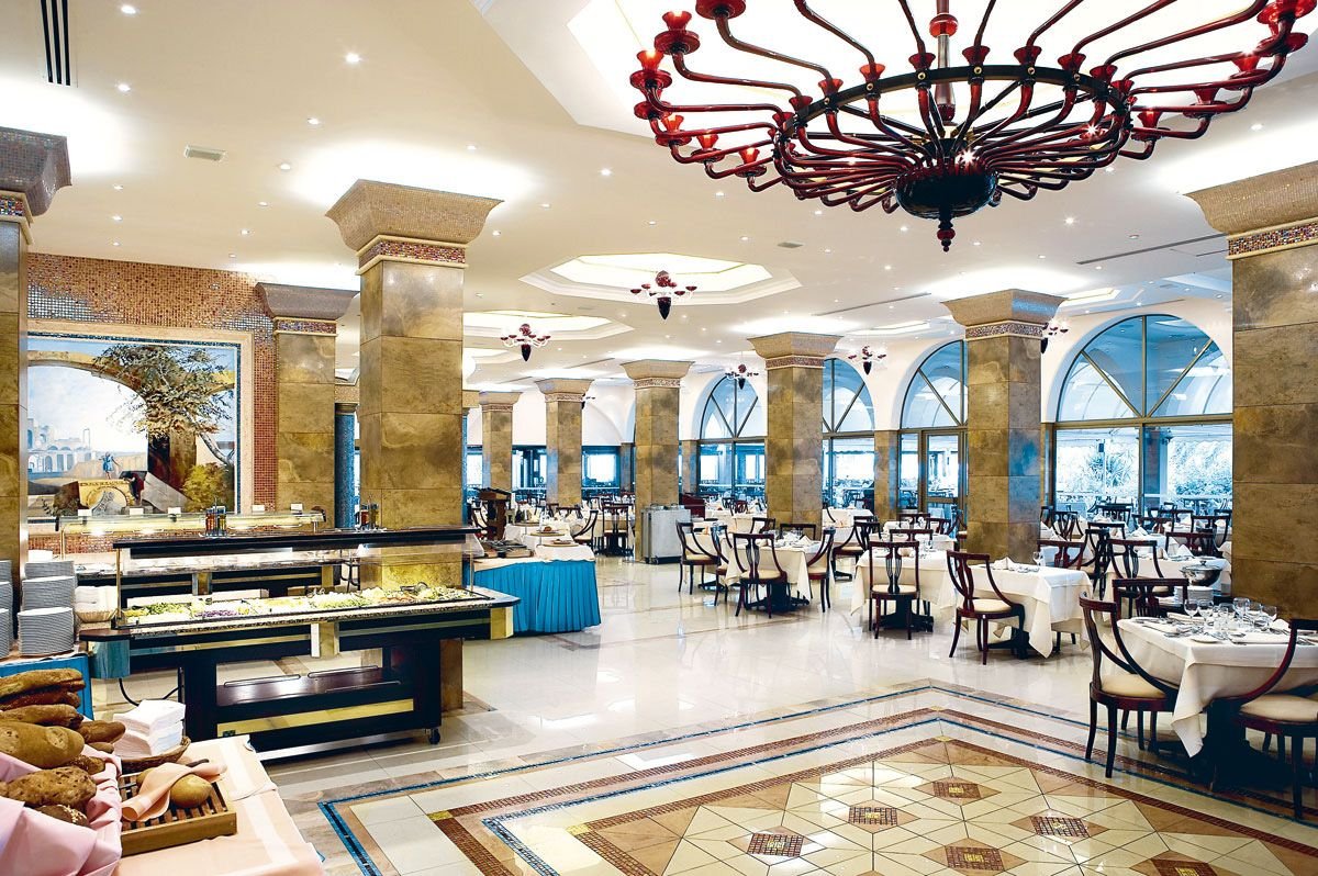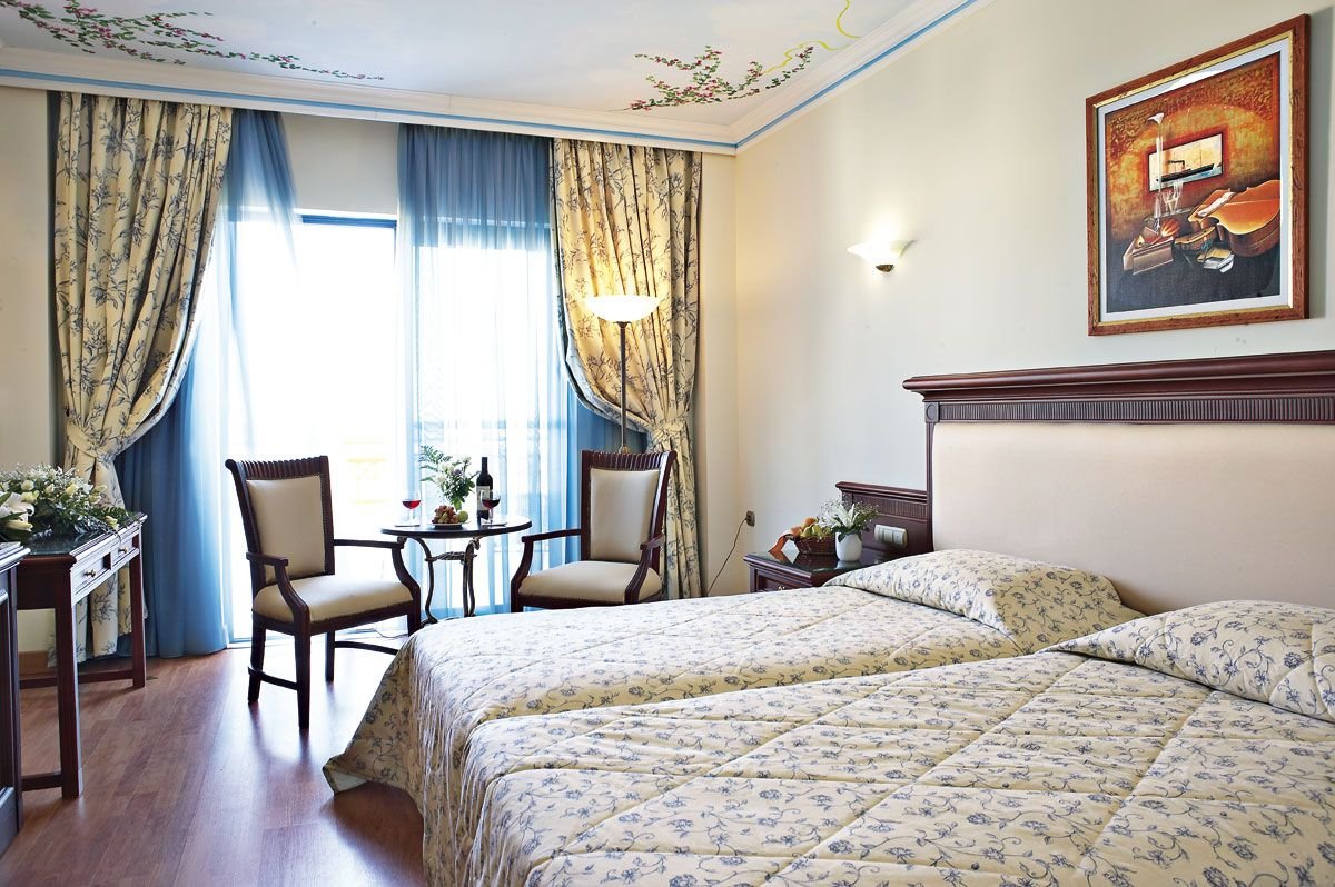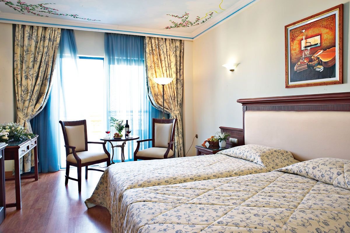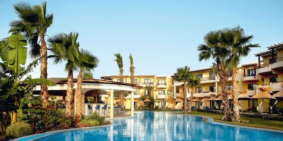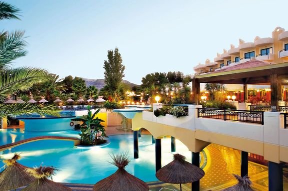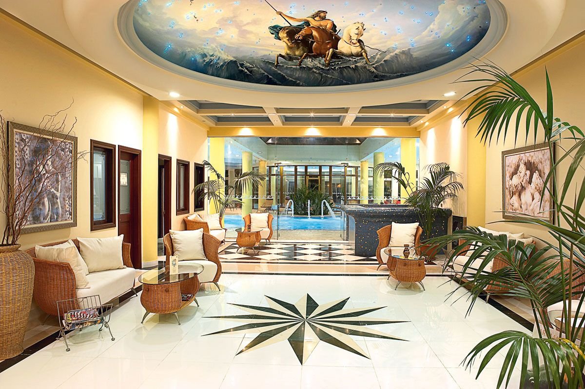 Elegancki i stylowy robi wrażenie juz od samego wejścia: wytworne, marmurowe lobby, eleganckie restauracje i bary, piękne baseny idealnie wkomponowane w fantastyczny ogród z palmami i tropikalnymi kwiatami, który dochodzi aż do samej plaży, z bezpłatnymi parasolami i leżakami dla Gości. Restauracja Symposium zaprasza na bogate bufety i wieczory tematyczne poprzedzone aperitifem, w restauracji à la carte Asterias można skosztować świeże owoce morza i śródziemnomorskie specjały. Hotel ma własne centrum Spa z krytym basem z morską wodą.