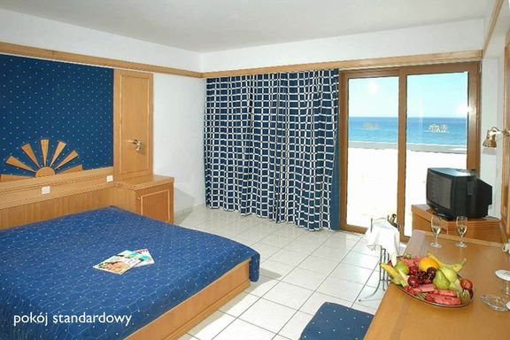 czterogwiazdkowy, elegancki i zadbany, zbudowany w 2000 r., 158 pokoi, 3 połączone ze sobą budynki, 1 piętro, 1 winda, przestronne lobby, całodobowa recepcja, restauracja - dania w formie bufetu, obsługa kelnerska, kuchnia międzynarodowa, śródziemnomorska, grecka; dostępne foteliki i menu dla dzieci, dania wegetariańskie, inne diety na zamówienie; 3 bary, w tym przy basenie i przy plaży, minimarket (żywność, napoje, prasa - także polska); sala konferencyjno-bankietowa dla 300 osób, taras z widokiem na basen i morze, ogród z roślinnością śródziemnomorską o powierzchni ok. 10 tys. m²; za opłatą: punkt internetowy (na monety, ok. 0,5 EUR/8 min), internet bezprzewodowy (ok. 1 EUR/dzień, ok. 10 EUR/tydz.); akceptowane karty kredytowe: Visa, MasterCard.