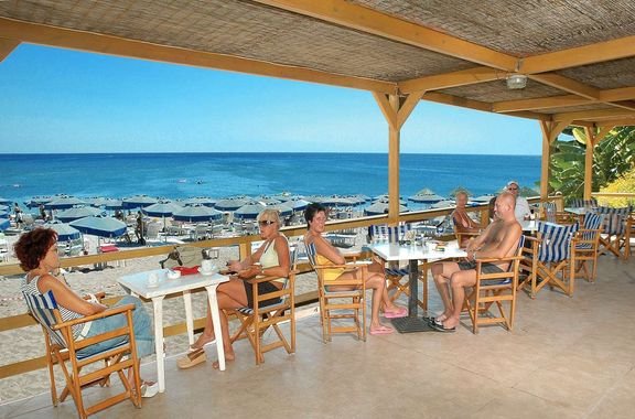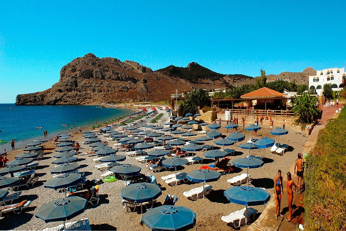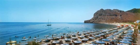 Kolymbia Beach, publiczna, piaszczysto-żwirkowa, łagodne zejście do morza, bezpośrednio przy hotelu, ok. 200 m od recepcji, dojście przez ogród hotelowy, parasole i leżaki płatne (ok. 6- 8 EUR/zestaw parasol i 2 leżaki), ręczniki za opłatą (ok. 4 EUR/tydz.).