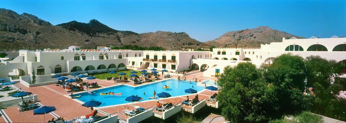 ok. 500 m od centrum KOLYMBII z barami, tawernami, sklepami i słynną Aleją Eukaliptusową, ok. 5 km od Seven Springs, ok. 30 km od miasta Rodos i Lindos; ok. 27 km od portu lotniczego na Rodos; przystanek autobusowy przed hotelem (Rodos, Lindos/ok. 3,5 EUR, plaża Tsambika/ok. 2 EUR).