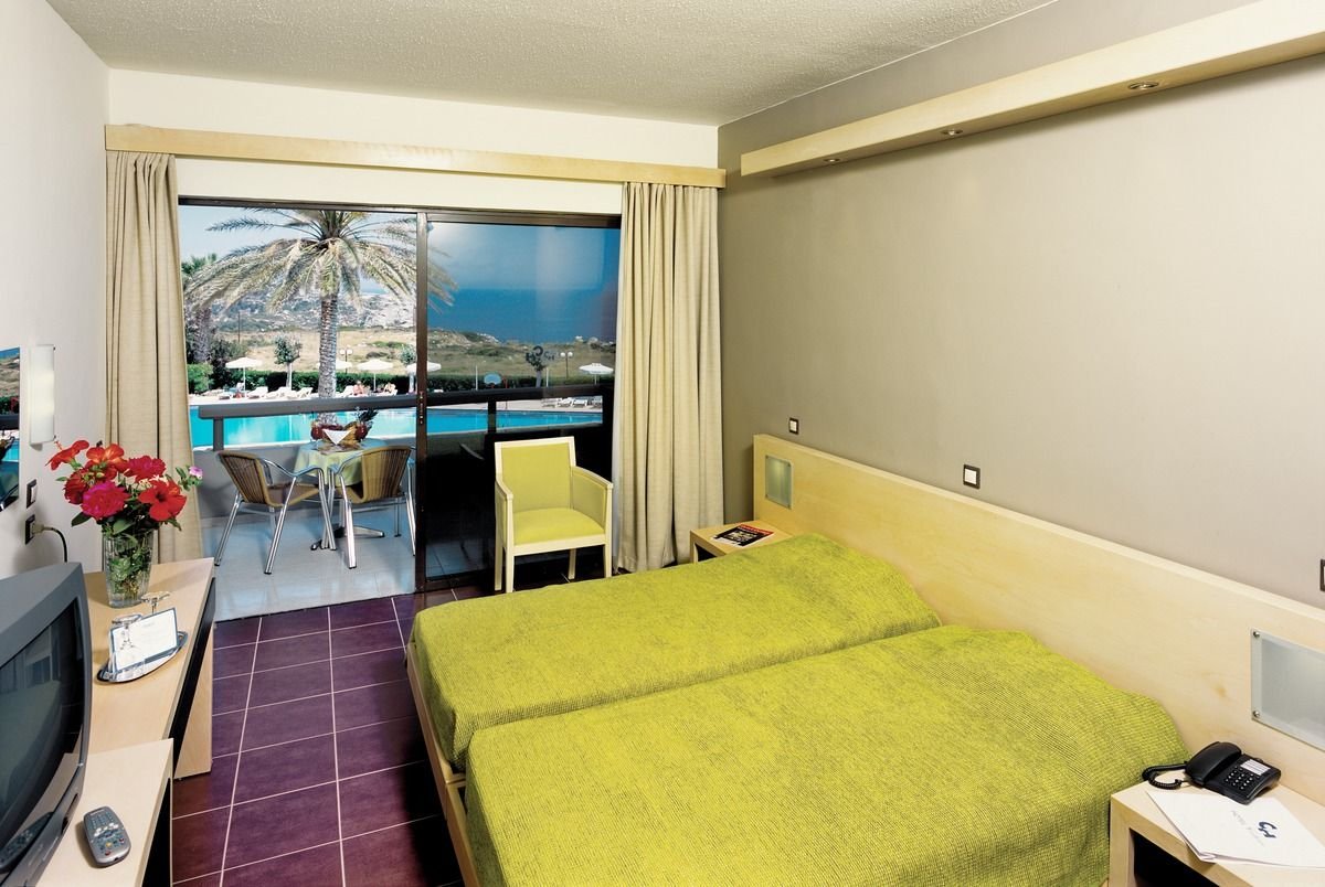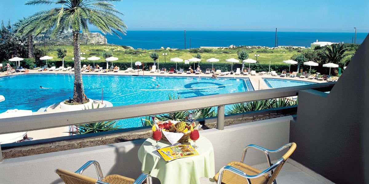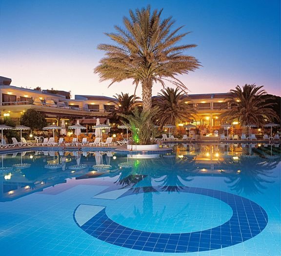 czterogwiazdkowy, zadbany i stylowy, zbudowany w 1990 r., całkowicie odnowiony w 2007 r., odnowiony w 2014 r., 205 pokoi, budynek główny oraz 5 budynków bocznych, 2 piętra, winda w budynku głównym, przestronne, eleganckie lobby, całodobowa recepcja, restauracja Olive – dania w formie bufetu, obsługa kelnerska, kuchnia międzynarodowa z greckimi specjałami, meksykańska, włoskie wieczory tematyczne, show-cooking, dania z grilla płatne (8 EUR/os.), dostępne foteliki dla dzieci, dania wegetariańskie, Chevalier Bar (czynny 17.30-2.00); minimarket, sklep z pamiątkami i artykułami spożywczymi; taras z widokiem na morze i basen, zadbany ogród z drzewkami oliwnymi, bananowcami, cytrynami, palmami, hibiskusami, bugenwillami; za opłatą: kawiarenka internetowa (2 EUR/godz, 3 EUR/2 godz., 7 EUR/dzień); akceptowane karty kredytowe: Visa, MasterCard, American Express.