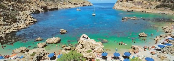 na wzgórzu, w małej miejscowości Ladiko, ok. 2,5 km od Faliraki; ok. 17 km od portu lotniczego w Rodos; przystanek autobusowy przed hotelem (ok. 1 EUR/Faliraki, ok. 3 EUR/Rodos).