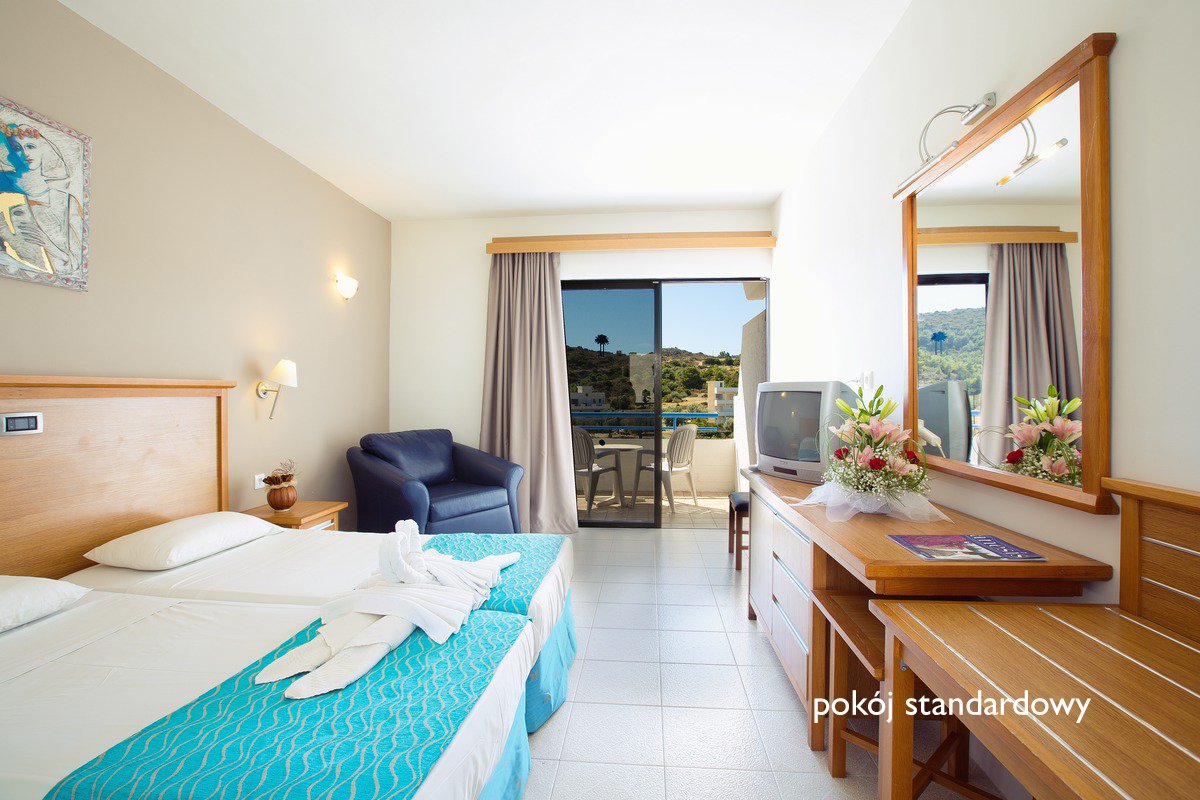 standardowy: 2-os. (możliwość 1 lub 2 dostawek – łóżko piętrowe), ok. 25 m², klimatyzowany (bezpłatnie w terminie: 15.06-15.09), łazienka (wanna, wc; suszarka), telewizja satelitarna, telefon, lodówka, sejf (płatny: ok. 15 EUR/tydz.); bezpłatne łóżeczko dla dziecka do 2 lat na zamówienie przed przyjazdem; balkon (stolik i krzesełka), widok na ogród lub basen; rodzinny: 2-os. (możliwość 2 dostawek), ok. 35 m², dwupomieszczeniowy, wyposażenie jak w pokoju standardowym; pokój rodzinny za dopłatą.