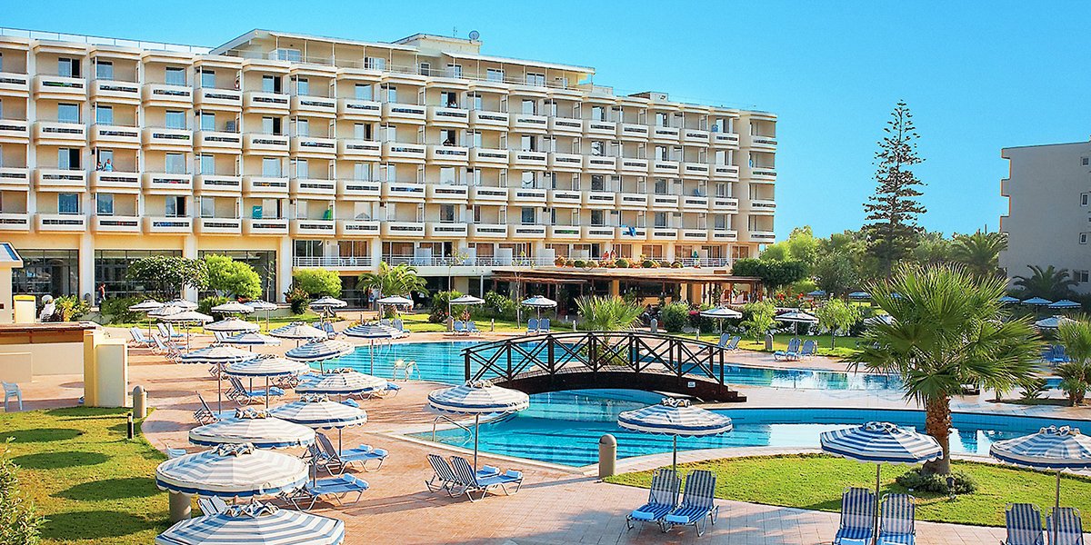pięciogwiazdkowy, elegancki, zbudowany w 1974 r., całkowicie odnowiony w 2007 r., rozbudowany w 2011 r. (spa i siłownia), 309 pokoi, budynek główny i budynek boczny, w budynku bocznym: 4 piętra, 1 winda, w budynku głównym: 6 pięter, 3 windy, duże, eleganckie lobby, całodobowa recepcja, restauracja główna International – dania w formie bufetu, kuchnia międzynarodowa i grecka, do kolacji wymagany strój formalny (panowie – długie spodnie), restauracja à la carte – obsługa kelnerska, kuchnia włoska, restauracja chińska – à la carte, obsługa kelnerska, kuchnia chińska; w restauracjach dostępne foteliki i menu dla dzieci oraz dania wegetariańskie, bar w lobby, bar przy basenie, lounge bar; minimarket, jubiler, sklep z pamiątkami; taras z widokiem na basen, duży ogród z bujną roślinnością śródziemnomorską, bezpłatny internet bezprzewodowy na terenie hotelu; za opłatą: bezprzewodowy szybki internet (ok. 4 EUR/godz.) i punkt internetowy, opiekunka do dziecka (na zamówienie); akceptowane karty kredytowe: MasterCard, Visa.